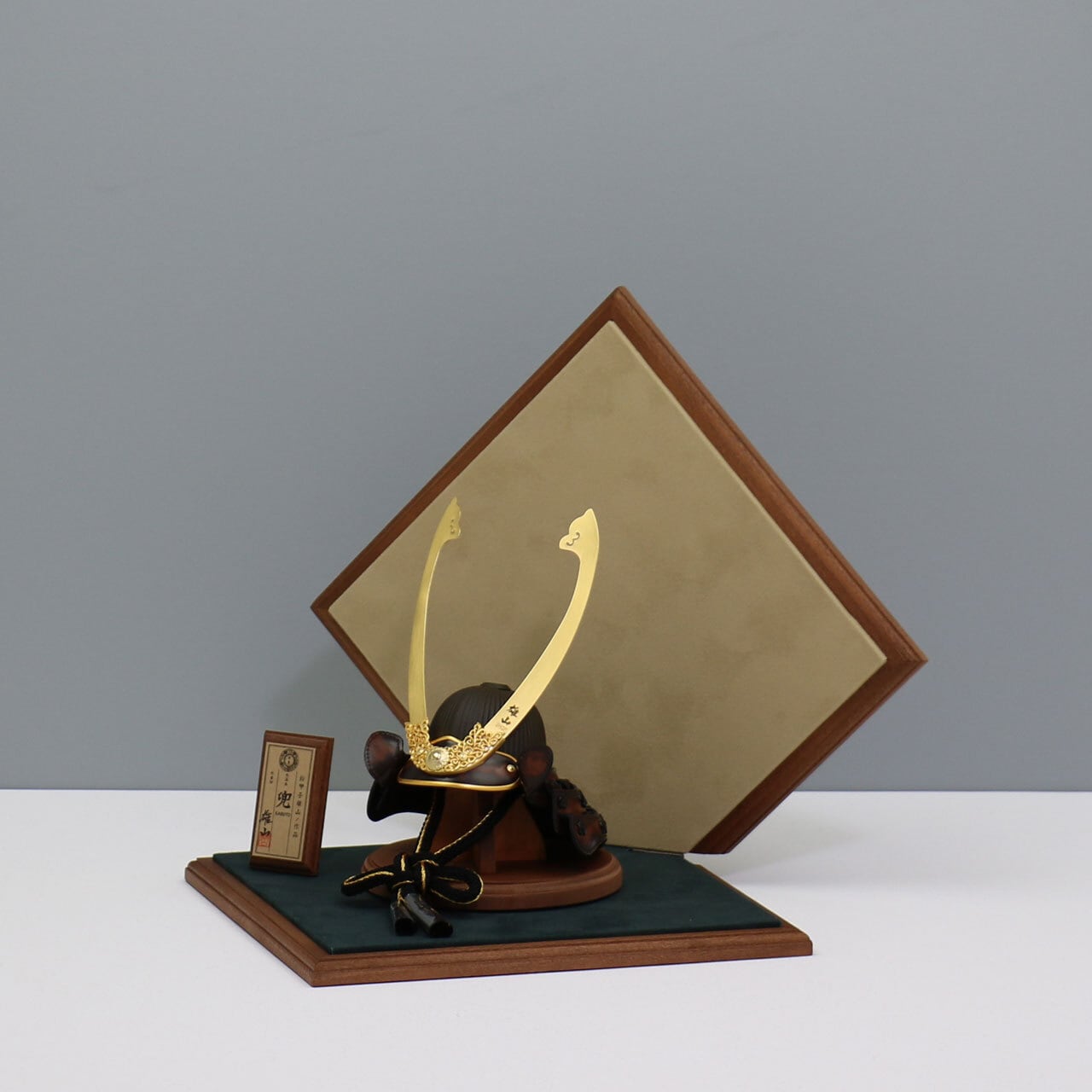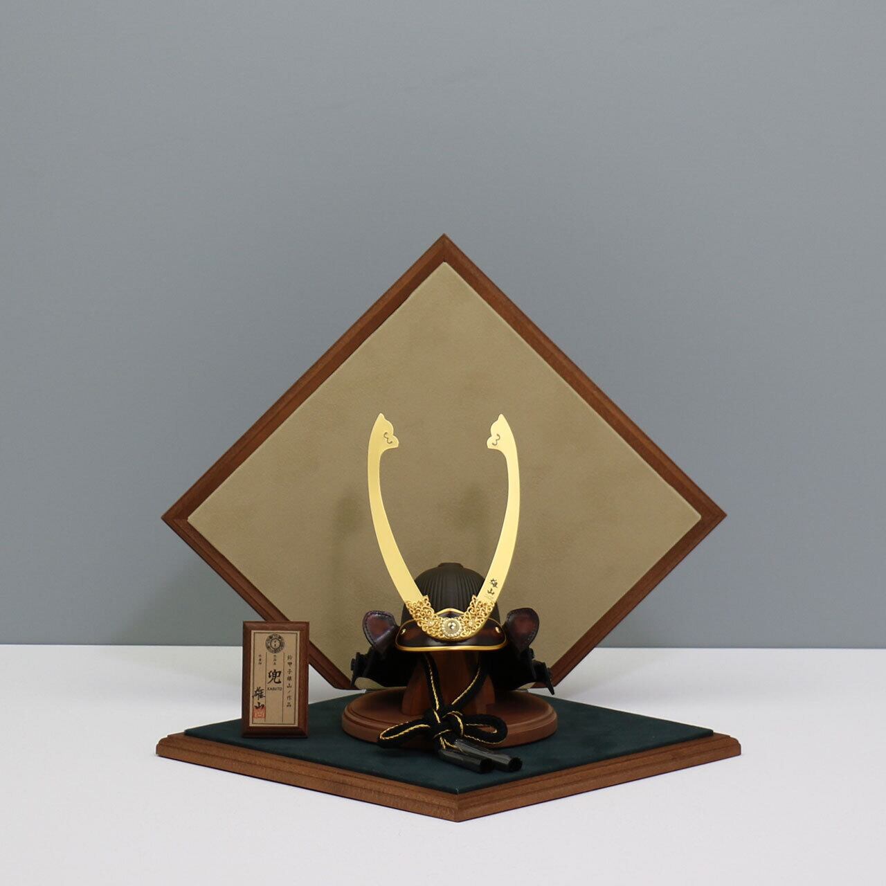 ベルベットの飾り台に配された兜は、柔らかな質感と高級感を兼ね備え、和洋どちらの空間にも調和。インテリアとしても映えるモダンなスタイルです。