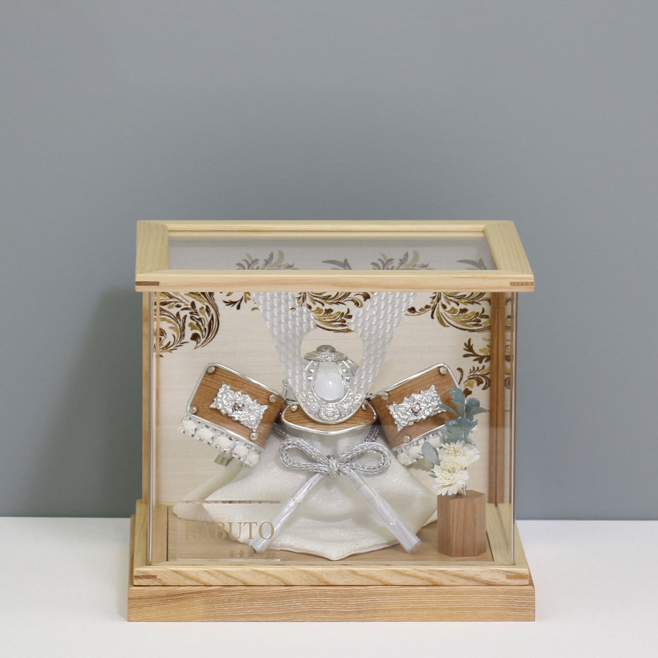 【銀茶中鍬兜】 兜飾り アクリルケース飾り 五月人形|木製|和モダン|フラワー|コンパクト