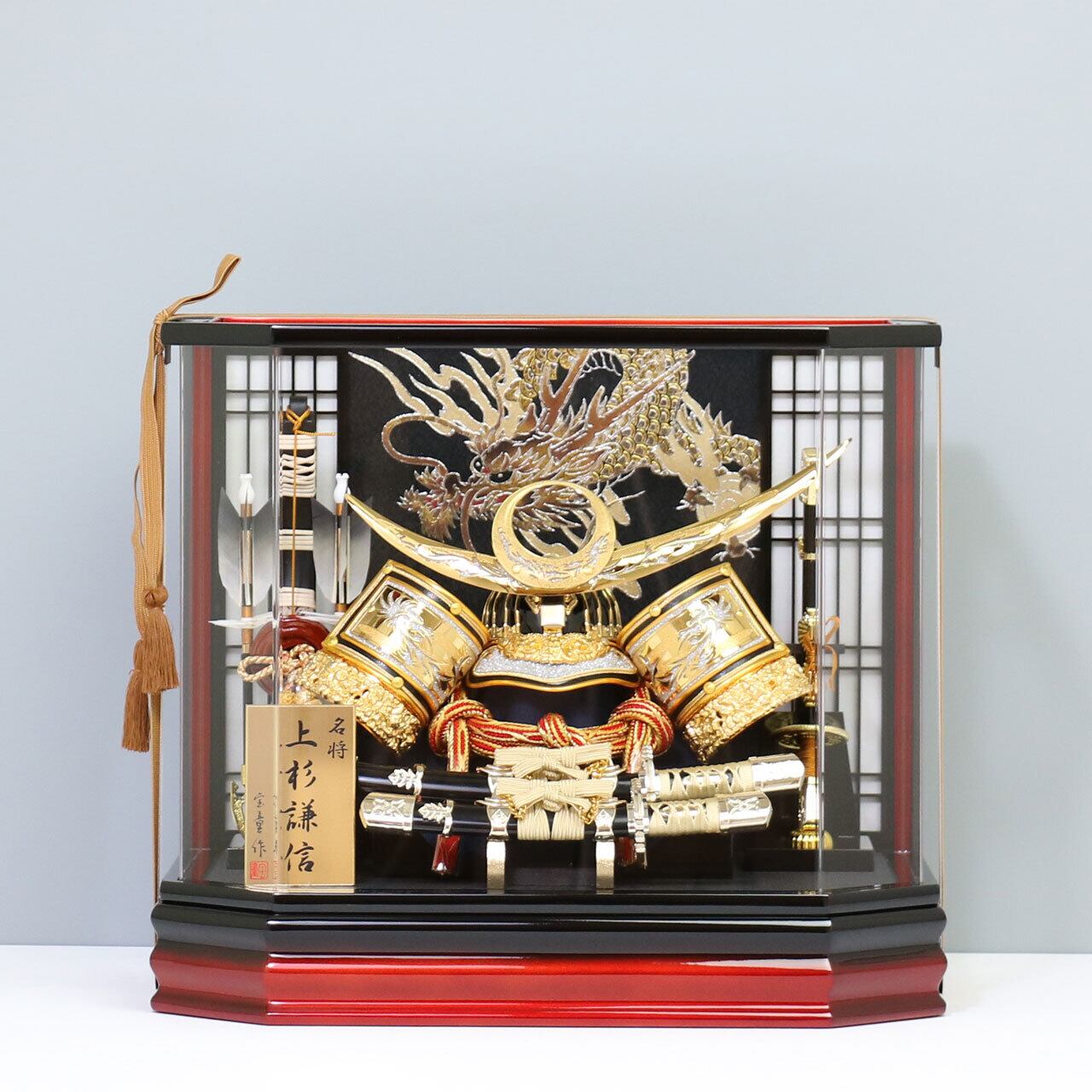 【上杉謙信 12号】 兜飾り アクリルケース飾り 五月人形|龍|矢付き|和モダン|コンパクト
