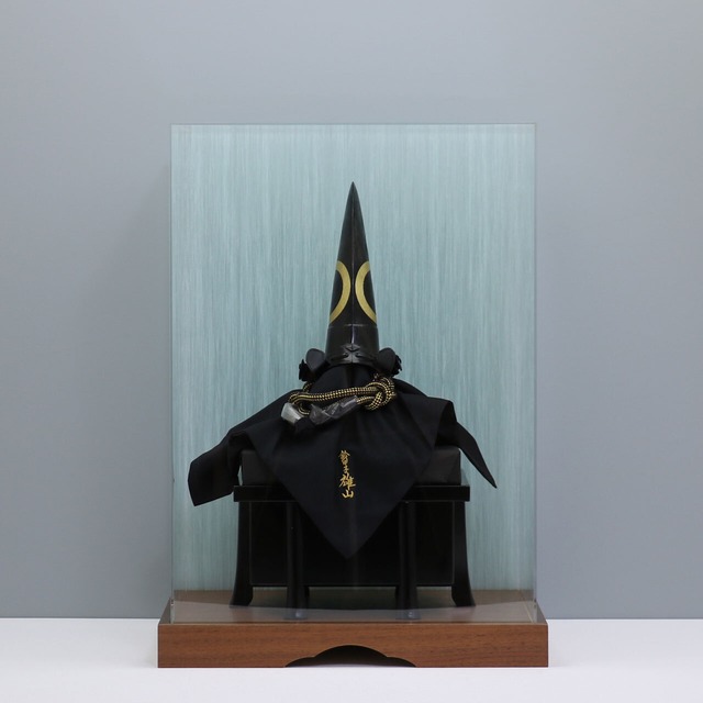 六角形のアクリルケースを使用しており、どの角度からも兜の精巧な姿をご覧いただけます。