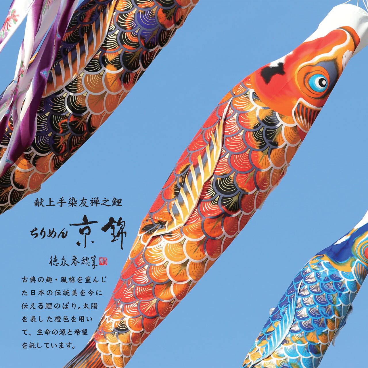 こちらの商品は、「徳永鯉のぼり 献上手染友禅之鯉 ちりめん京錦 庭園スタンドセット(3Ⅿ6点)」です。