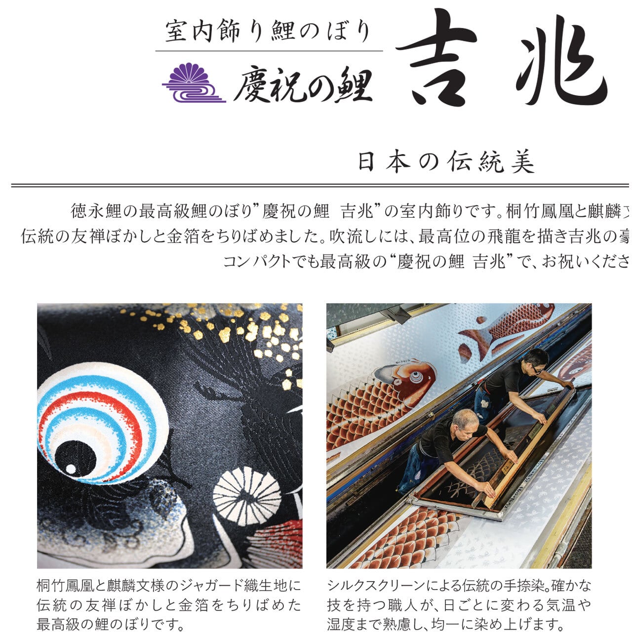 徳永鯉の最高級シリーズ「慶祝の鯉 吉兆」を、室内用にアレンジした豪華仕様。