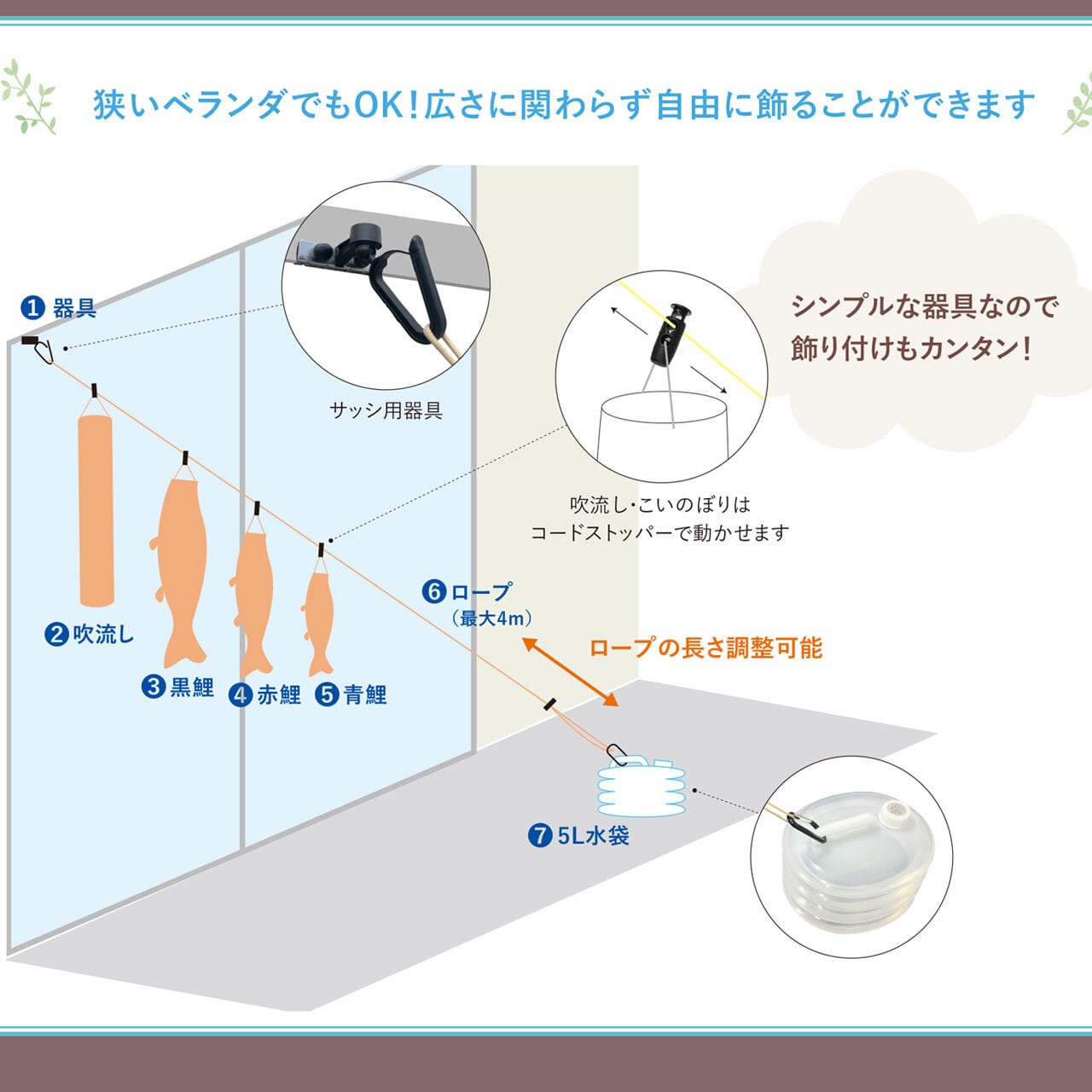 にわデコをコンパクトにした仕様で、窓辺やベランダ、中庭などの限られたスペースでも手軽に鯉のぼりを飾ることができます。