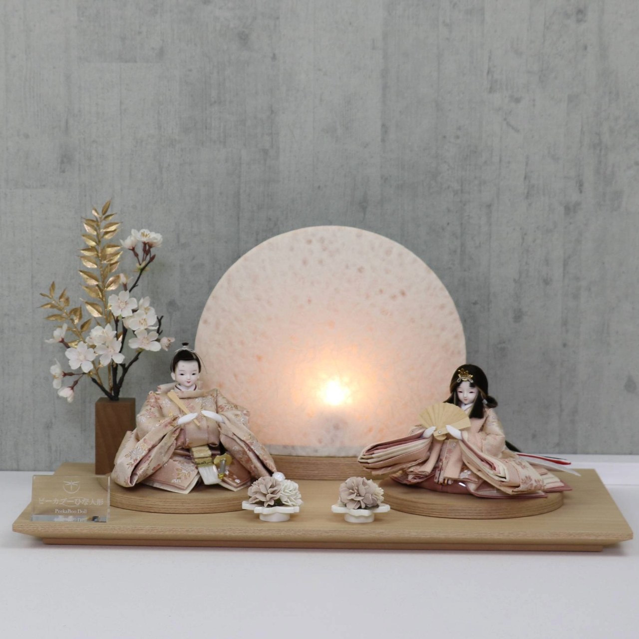 飾台はかすみ木製平台(約60cm)、背後には丸型の落水紙照明を配し、柔らかな光が人形とお飾りを優しく照らし出します。