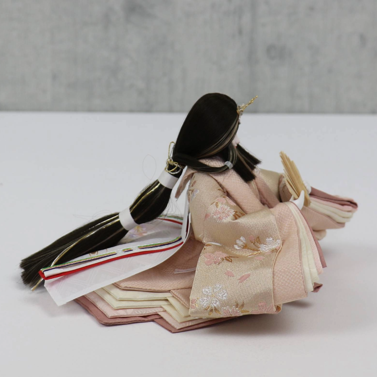 大芥子親王飾りの衣裳には金彩刺繍で桜文様をあしらい、華やかさと落ち着いた風合いを兼ね備えています。