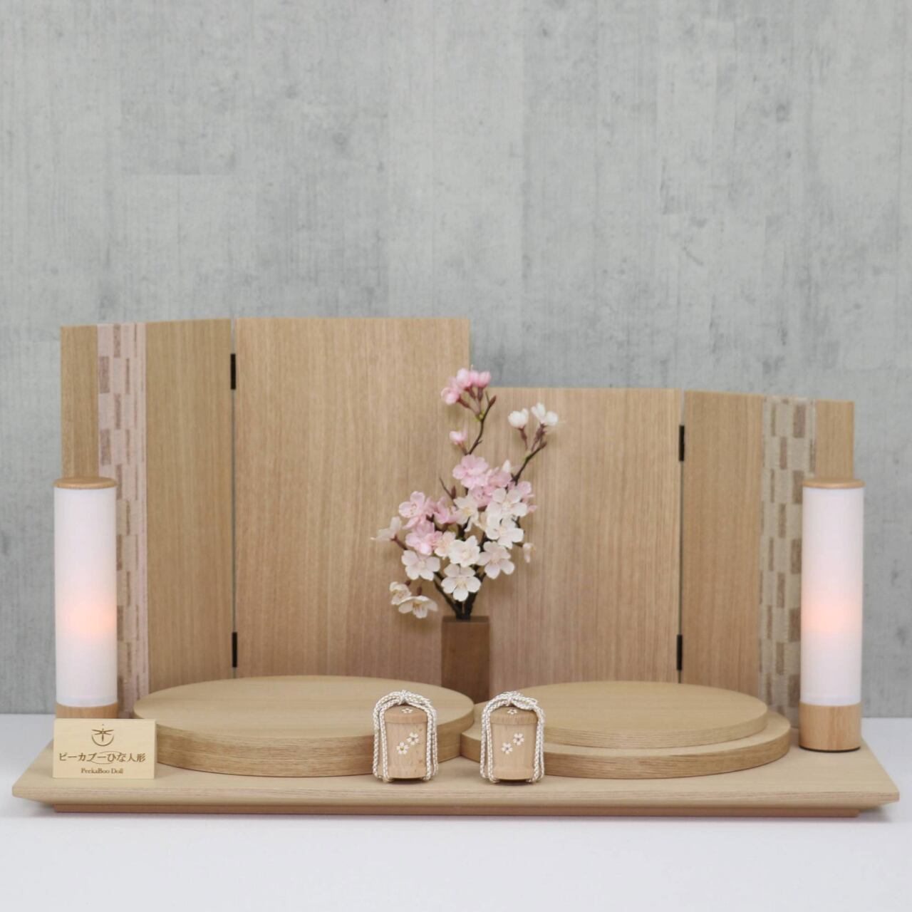 落ち着いた木目が美しい屏風と、可憐な桜をあしらった「淡桜の花飾り」が調和する上品なひな人形セットです。
