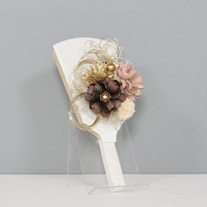 落ち着いたブラウンやベージュの花飾りが上品さを引き立て、ゴールドの水引が華やかなアクセントとなっています。