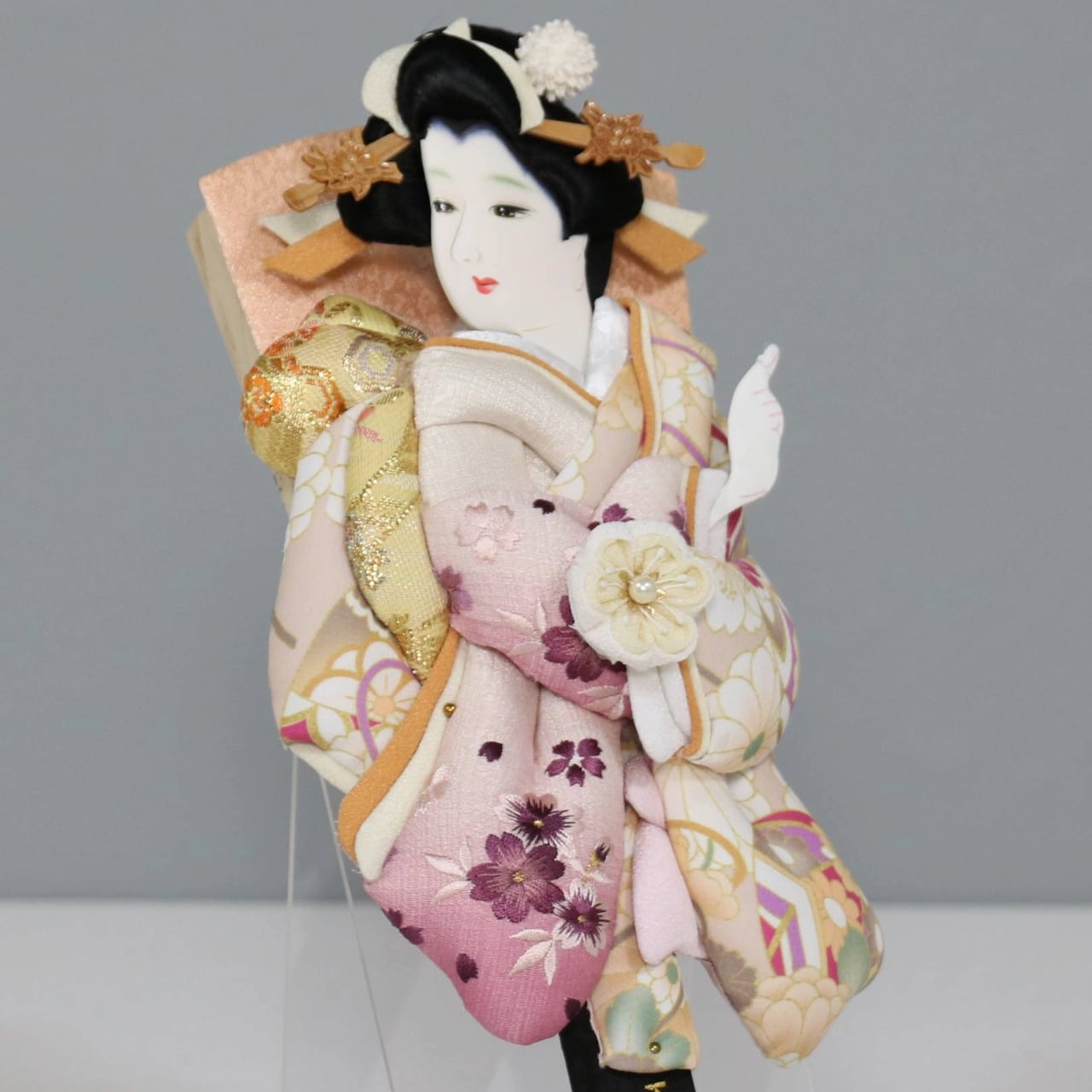 羽子板は「匠一好」で、淡いピンクやクリームを基調に、紫やゴールドを取り入れた振袖デザインとなっています。