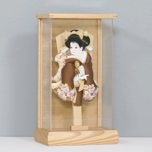 木製のアクリルケースに、刺繍入り振袖羽子板を配した羽子板飾りです。