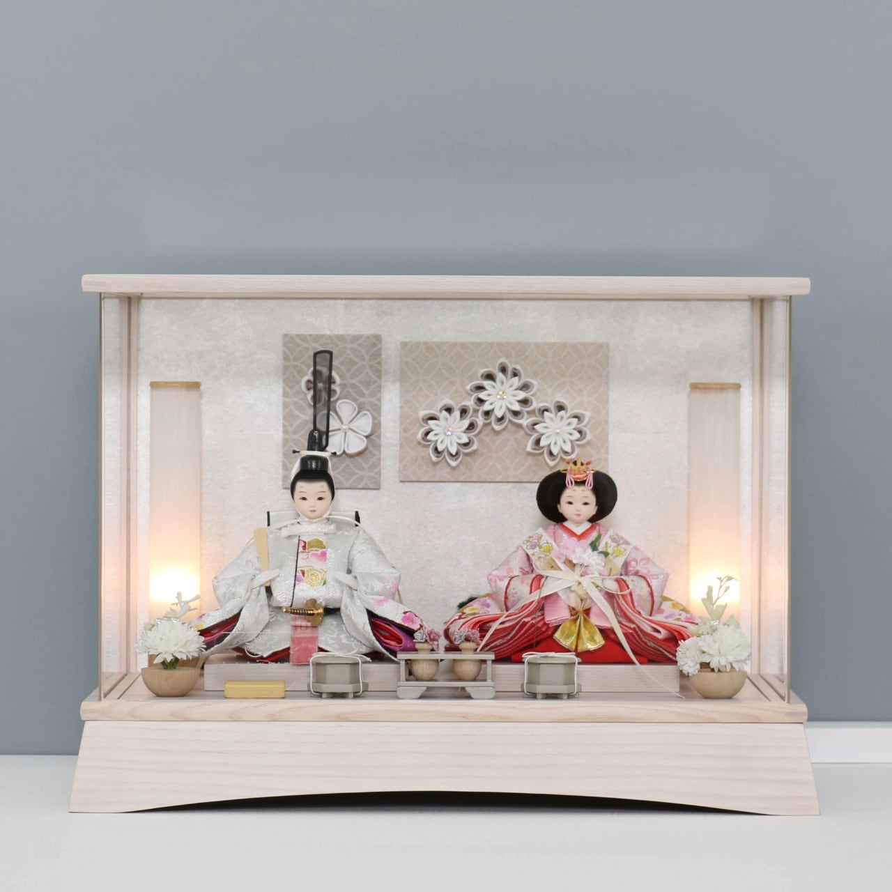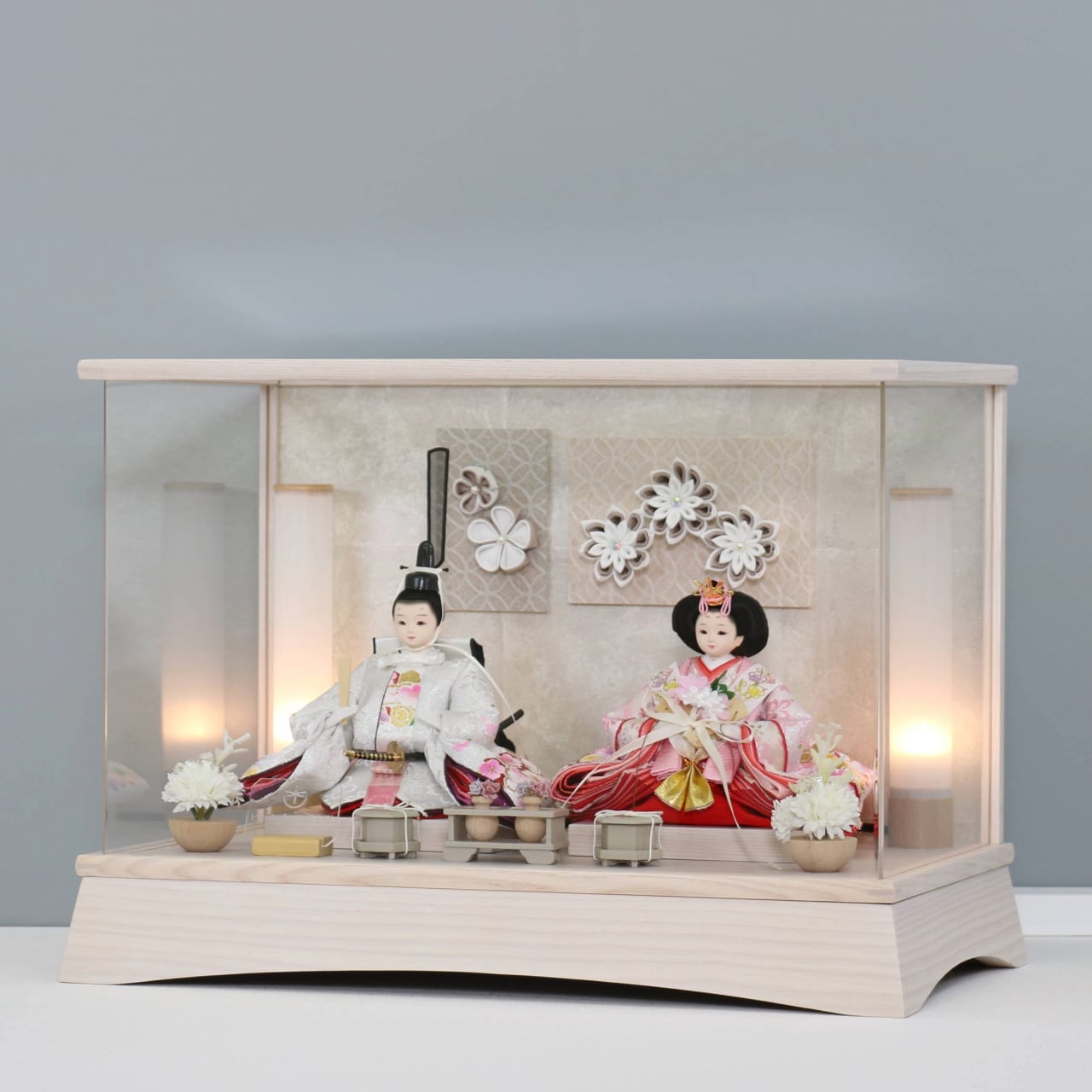 明るいマッシュホワイトの木製アクリルケースに、優しい色合いの親王飾りを組み合わせたお飾りです。