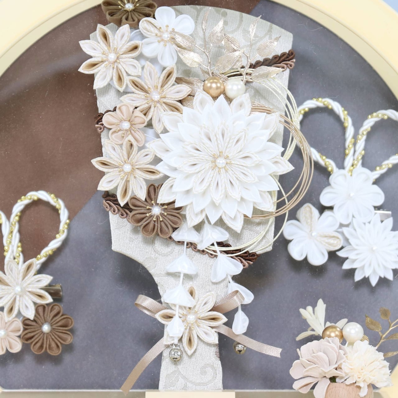 中央には大輪の花飾りを配置し、周囲には小花や紐飾りを添えることで、全体に調和のとれた華やかさを演出しています。