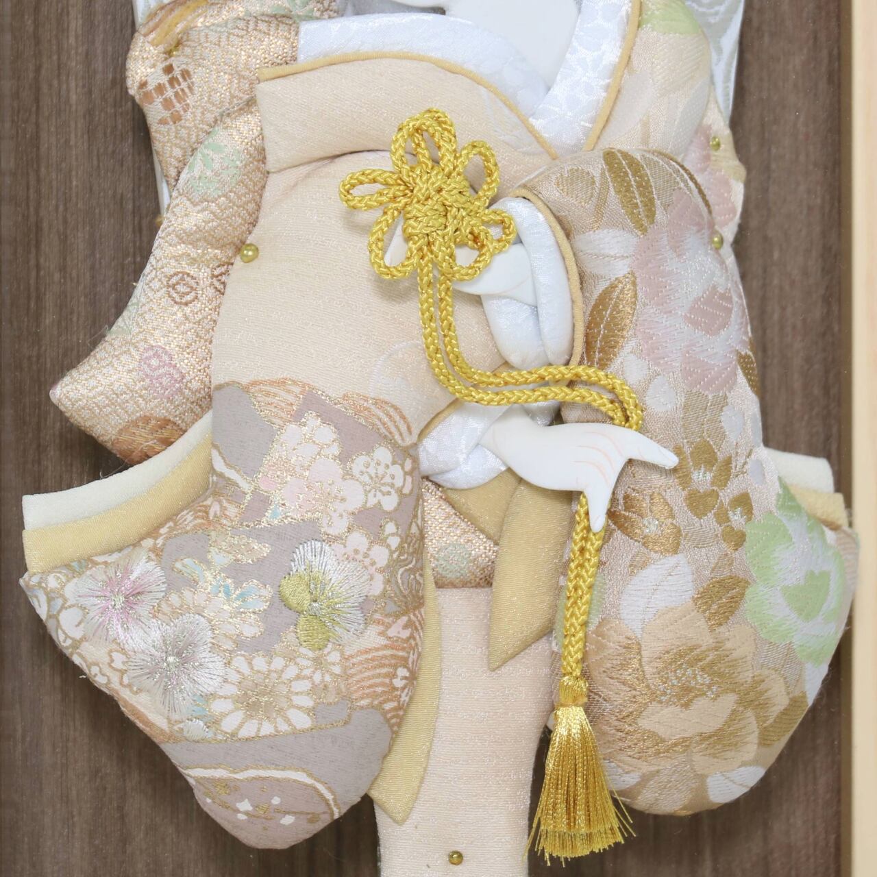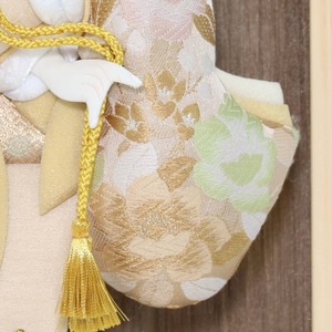 羽子板はベージュ・生成りを基調とした衣装でまとめられており、金糸や淡い緑色を取り入れた上品な仕上がりです。