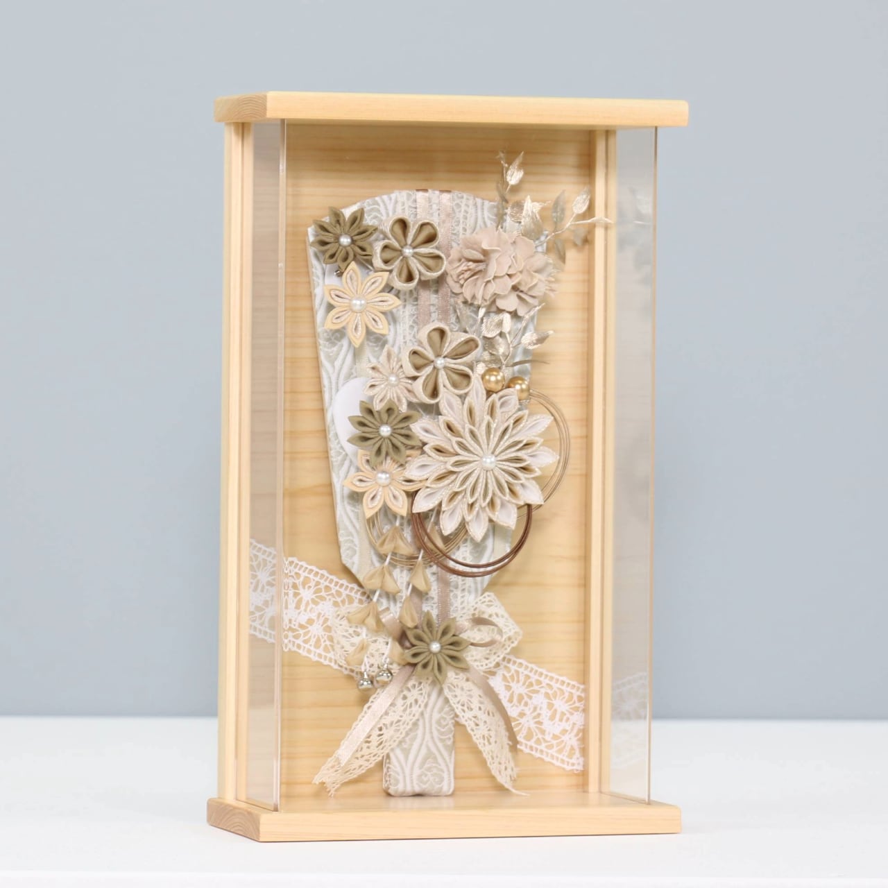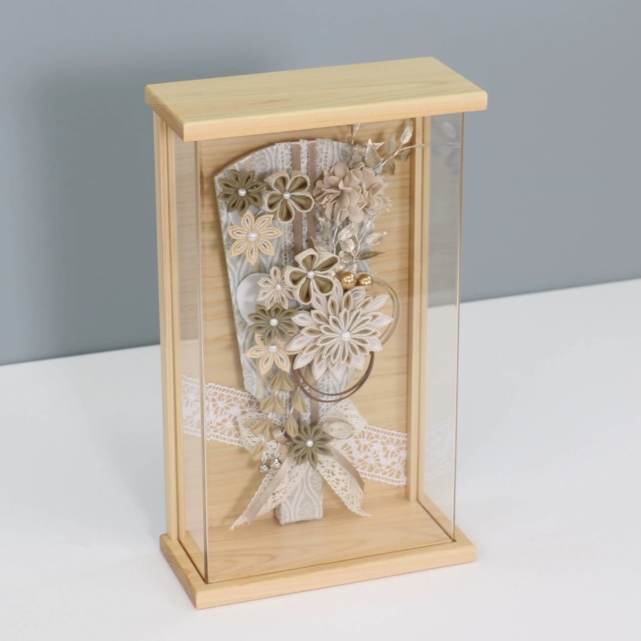 ひのき材を使用した木製アクリルケースに、花細工の羽子板を配した羽子板飾りです。