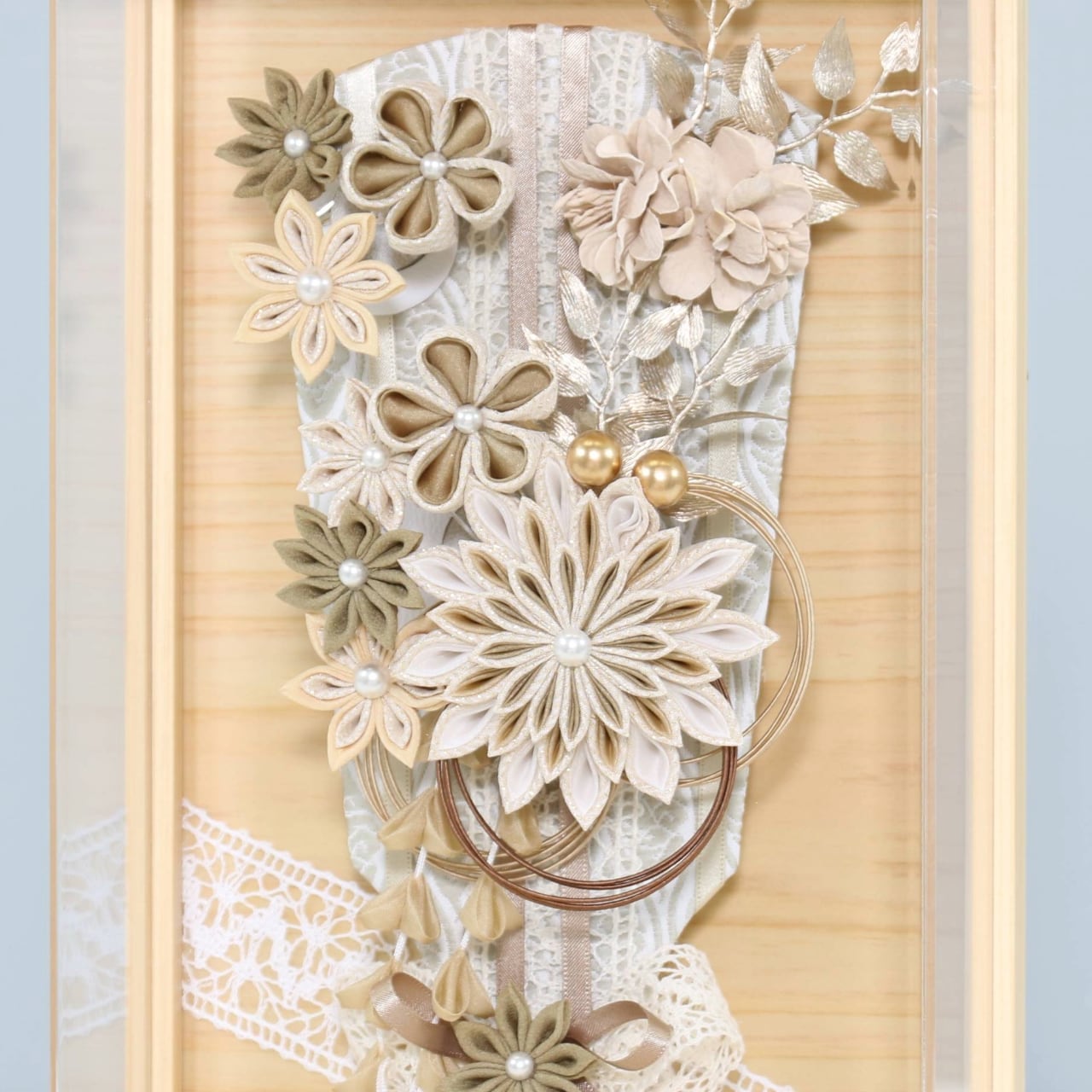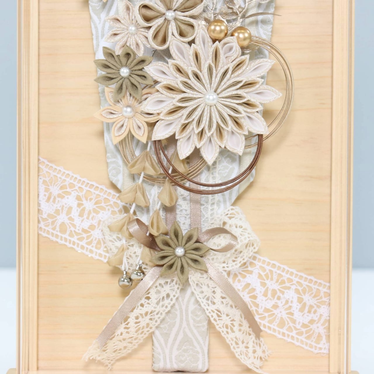 羽子板:つまみ羽子板(ホワイト・ベージュ基調、グレージュ花飾り、大輪花付き)
