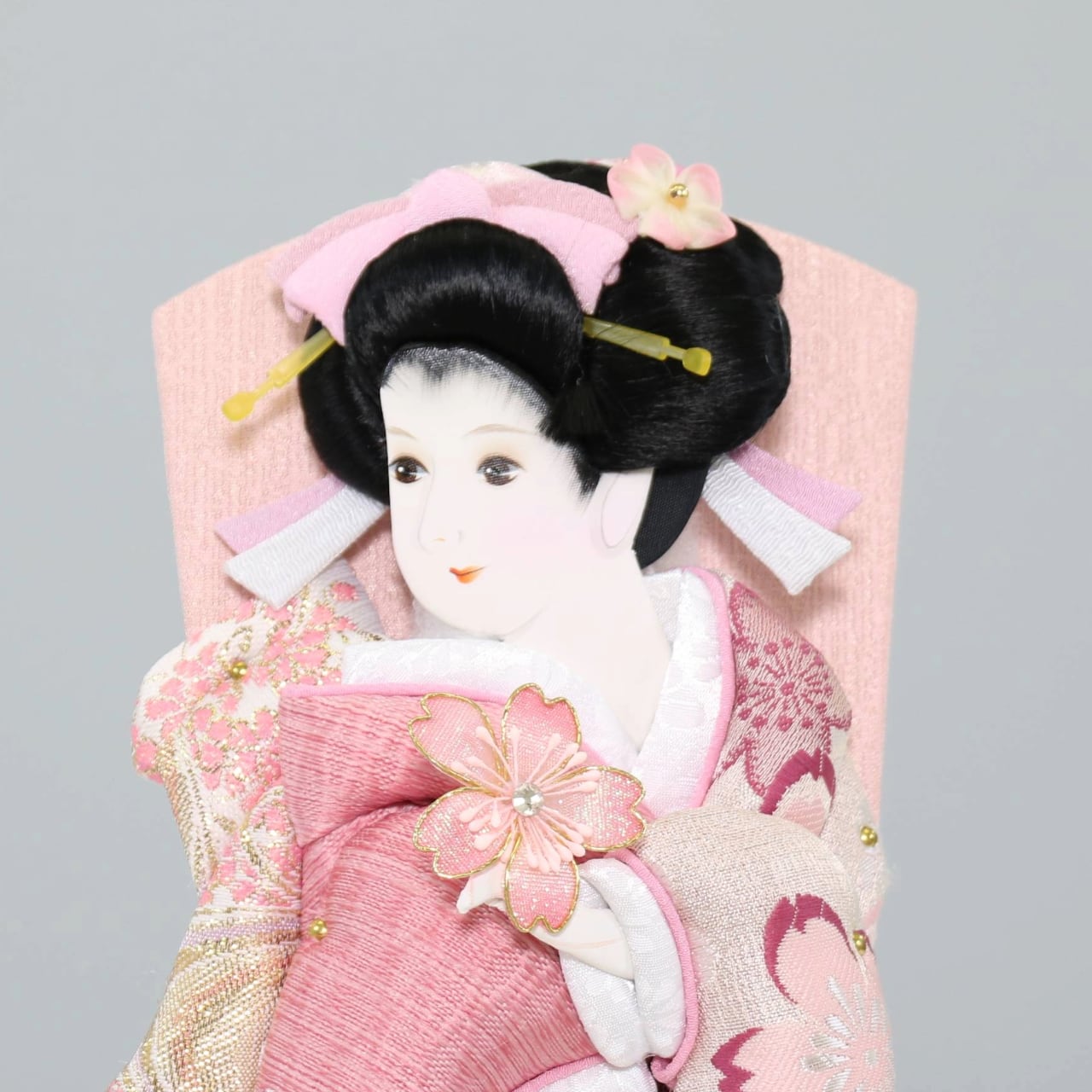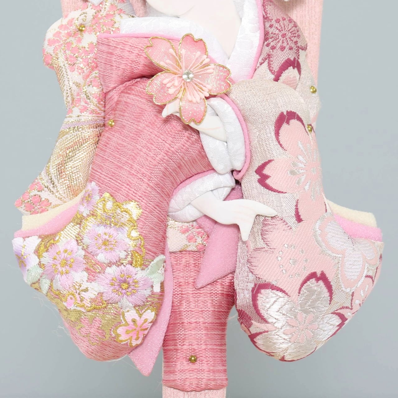 羽子板はピンクを基調とした振袖をまとい、桜柄の刺繍や金彩をあしらった華やかな衣装となっています。