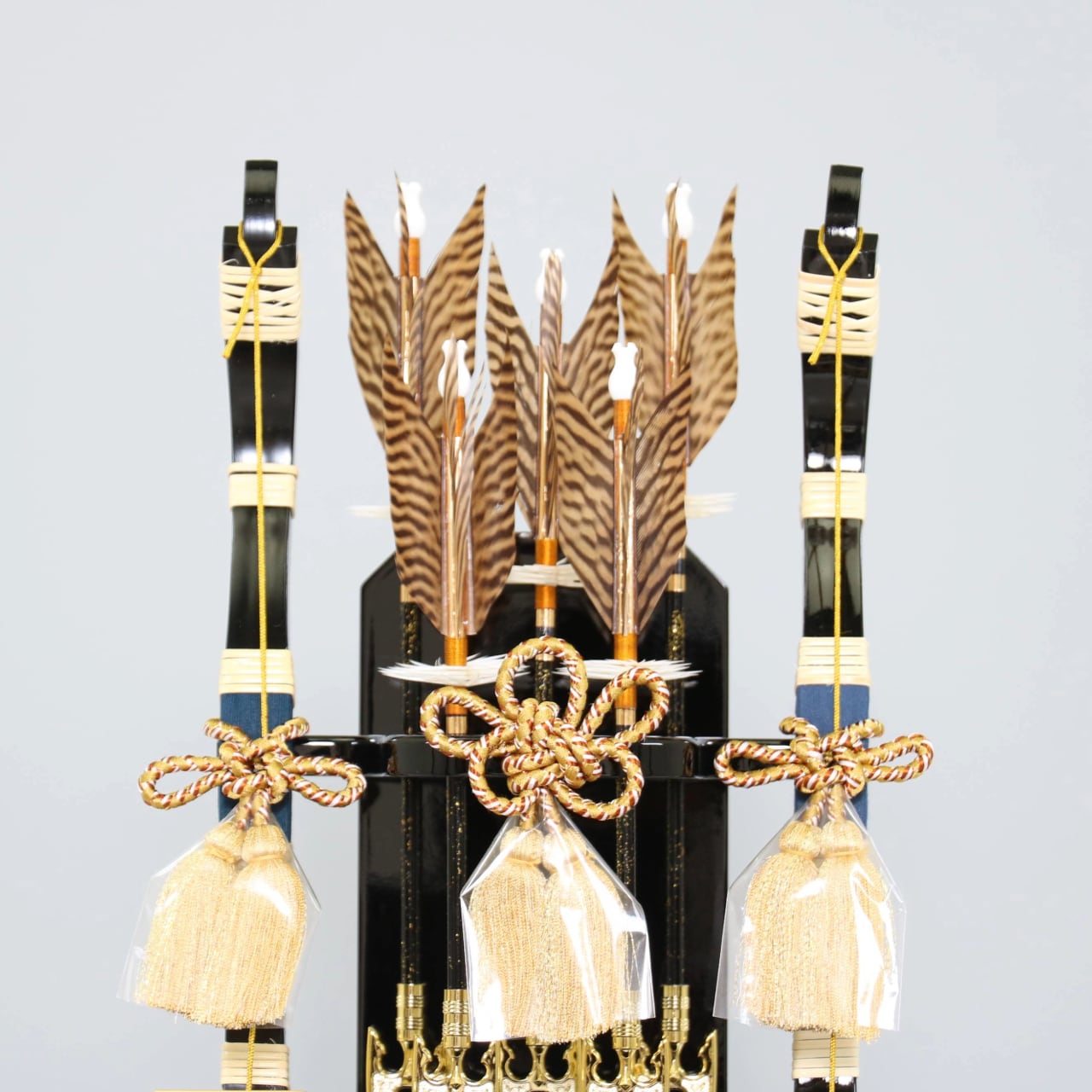 破魔弓は五本矢の構成で、中央部は飾り紐と房を備え、矢羽根は柄のある羽根を使用しています。矢台や持ち手部分は黒を基調とした配色で、金具や飾り紐の色と調和しています。下部には金色装飾を含む土台が設置され、全体の統一感を高めています。左右に小型の弓を添え、前面には作札を配置しています。