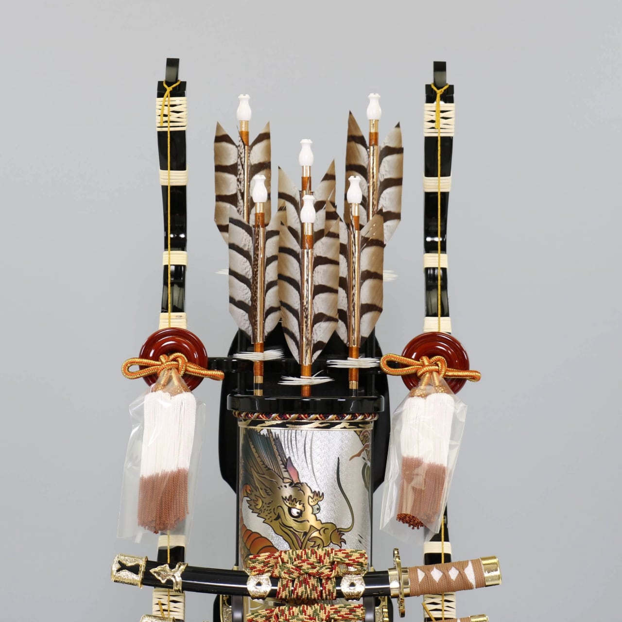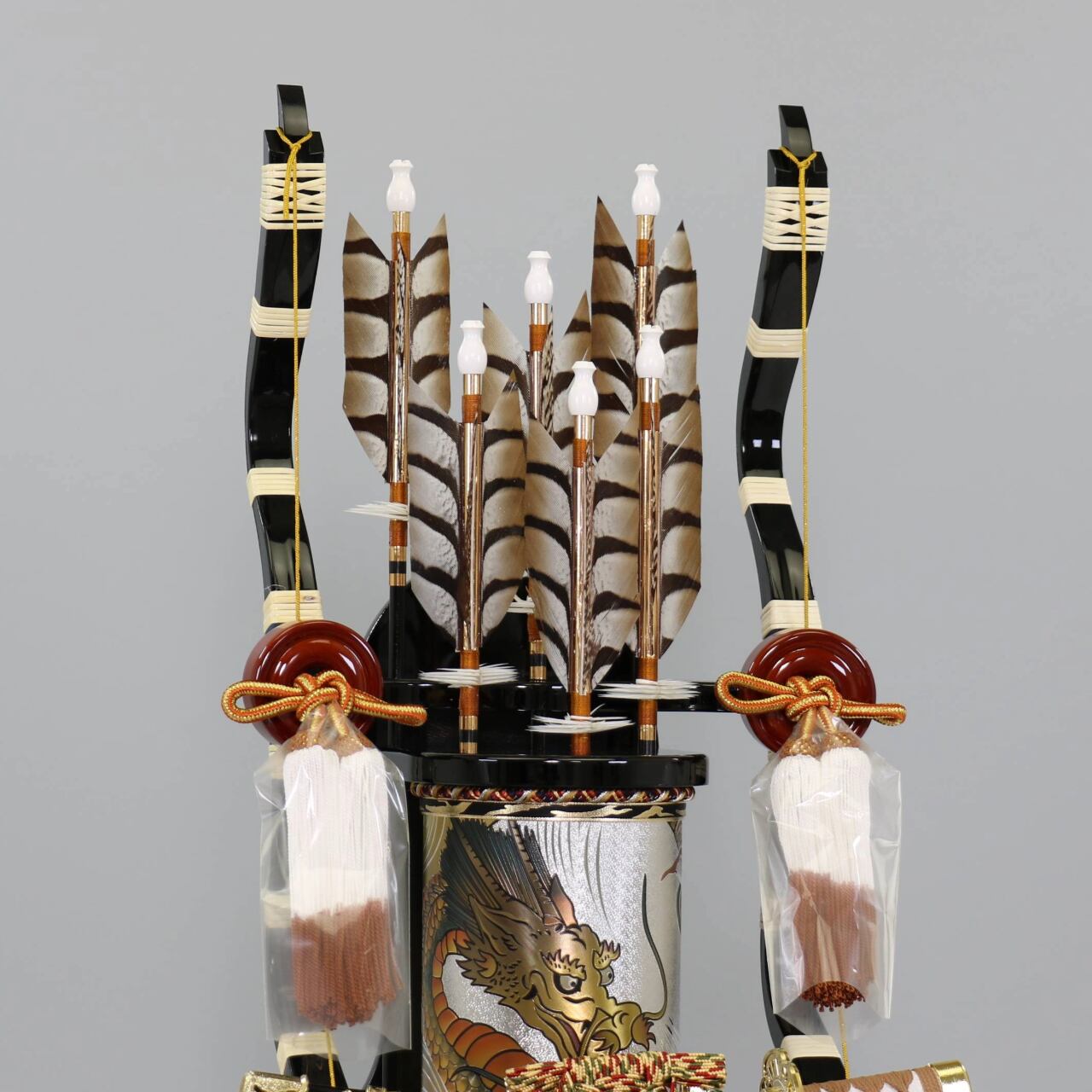 破魔弓は柄入り羽根を用いた六本矢構成で、中央に太鼓型の台座を設置し、龍の図柄をあしらった装飾が施されています。左右には房付きの飾り紐を備え、矢台の色味と金具の組み合わせにより全体が統一された印象にまとまっています。前面には作札を配置し、飾りの情報性を高めています。