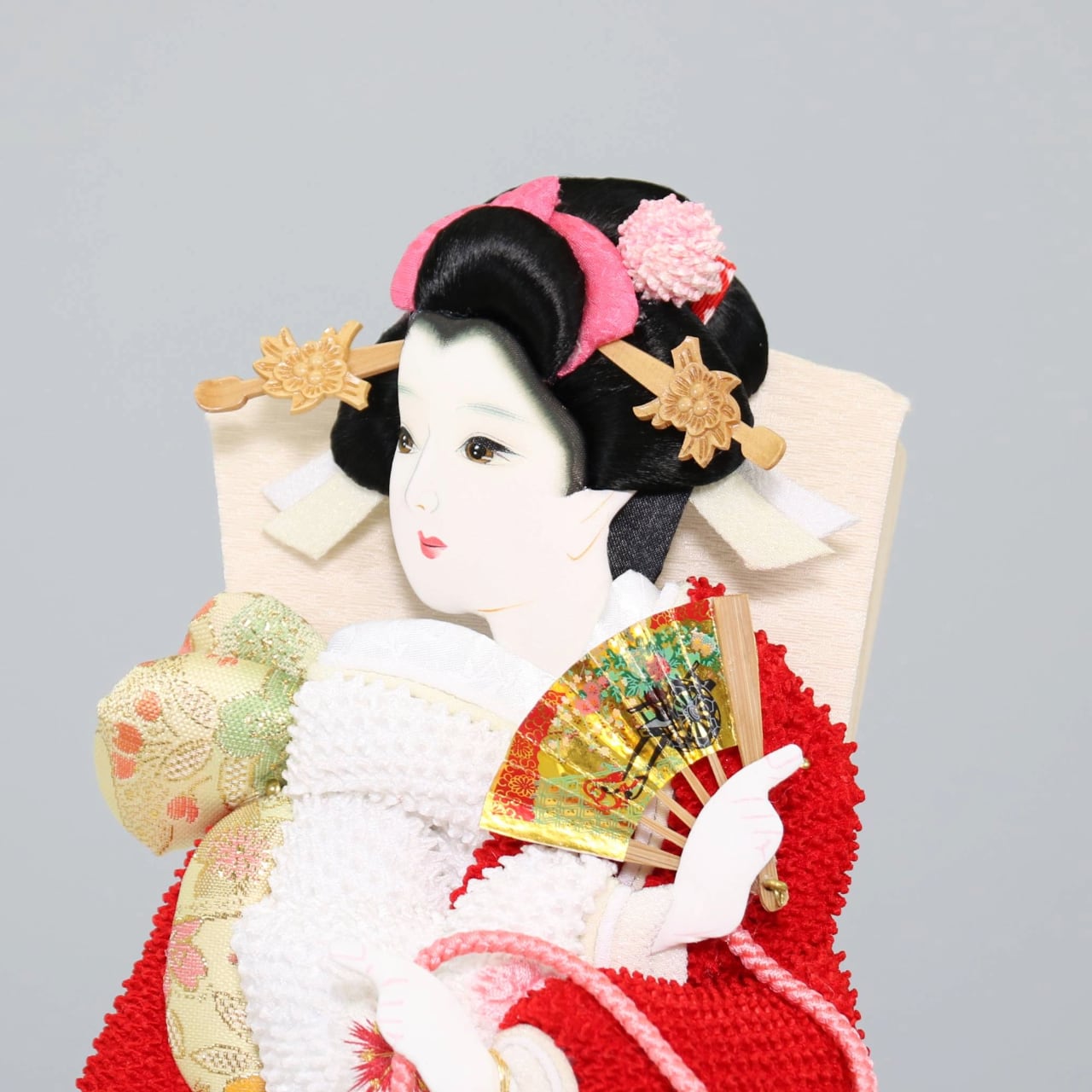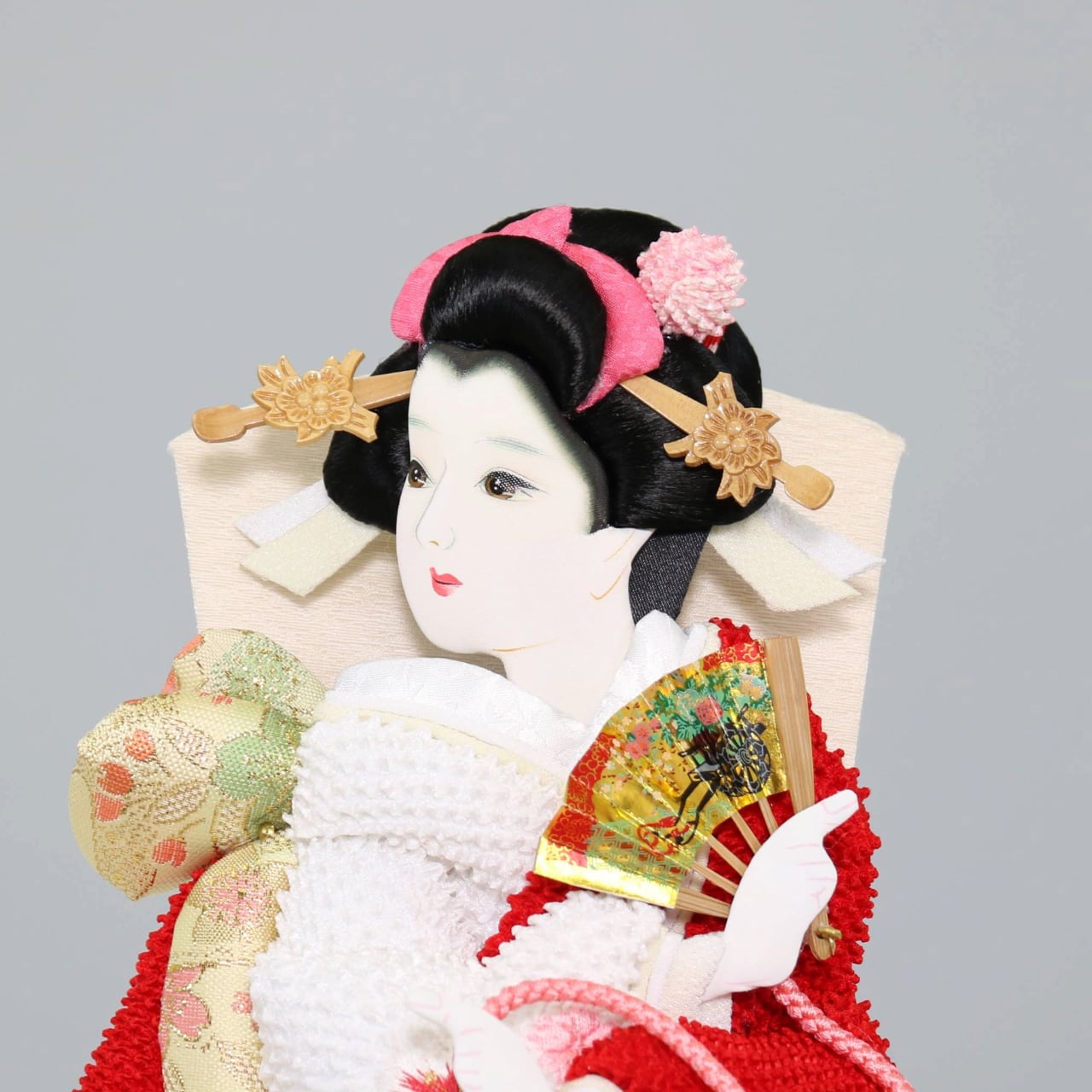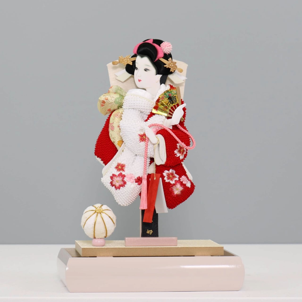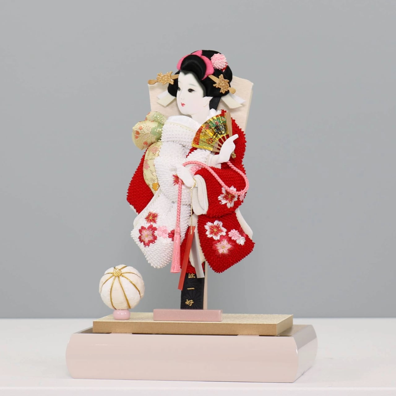 羽子板は赤と白を基調とした衣装を用い、桜柄の刺繍を施した振袖羽子板です。手元には金色の扇を持ち、頭飾りには花飾りと金細工を組み合わせています。付属の飾りとして白系の手毬飾りが配置され、羽子板の色合いと統一感を持たせています。背景は淡いピンク色で、羽子板本体を明るく見せる構成です。