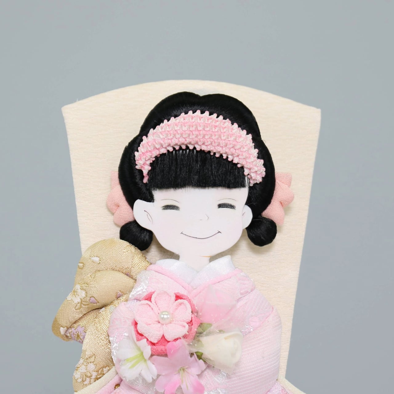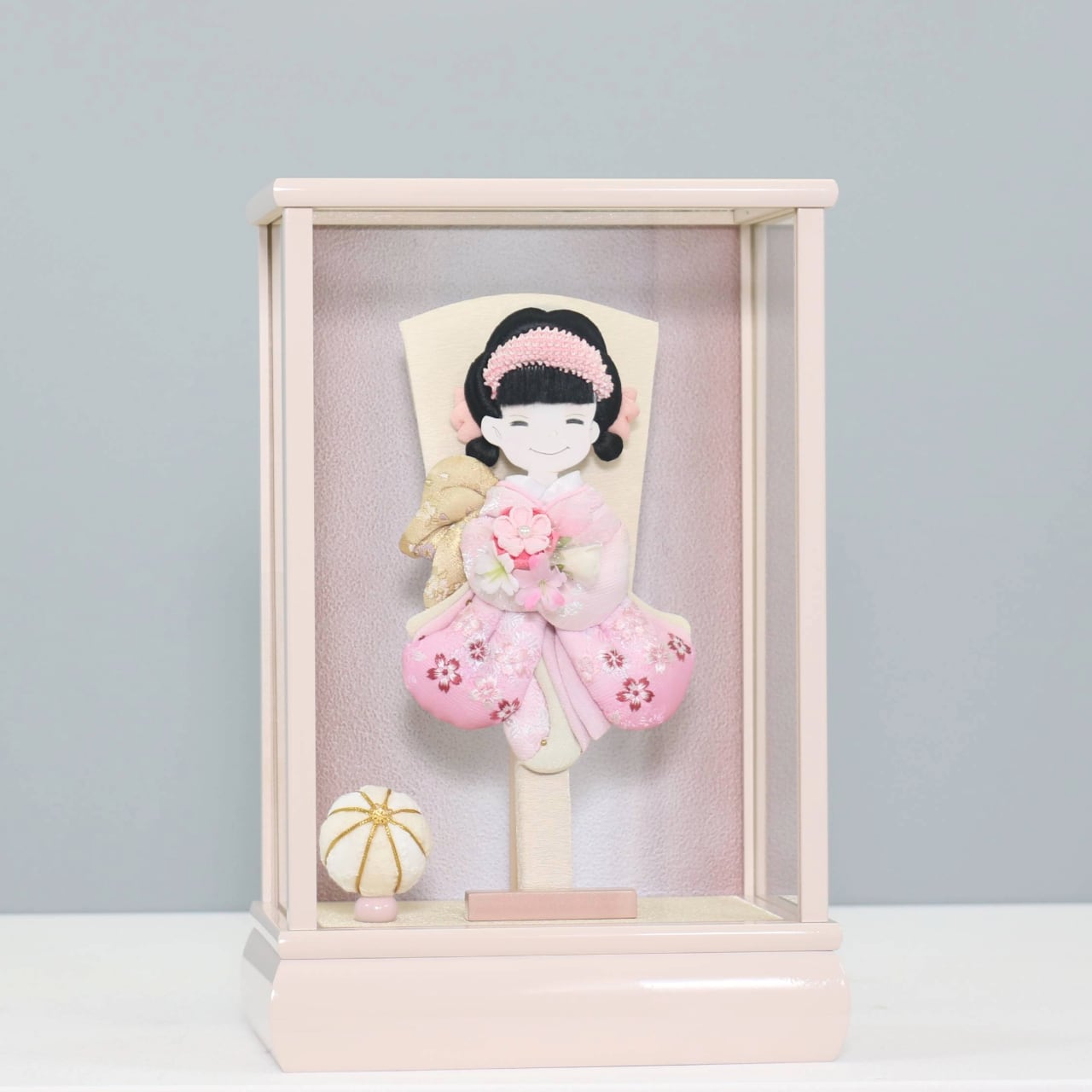 羽子板はピンク系の振袖衣装を用いた仕立てで、桜柄の生地を組み合わせています。表情は微笑み顔のデザインで、柔らかい印象の羽子板です。付属品として白系の手毬飾りを配置し、ケース内の構成に統一感を持たせています。背景はピンク系で、羽子板本体との色味を合わせています。