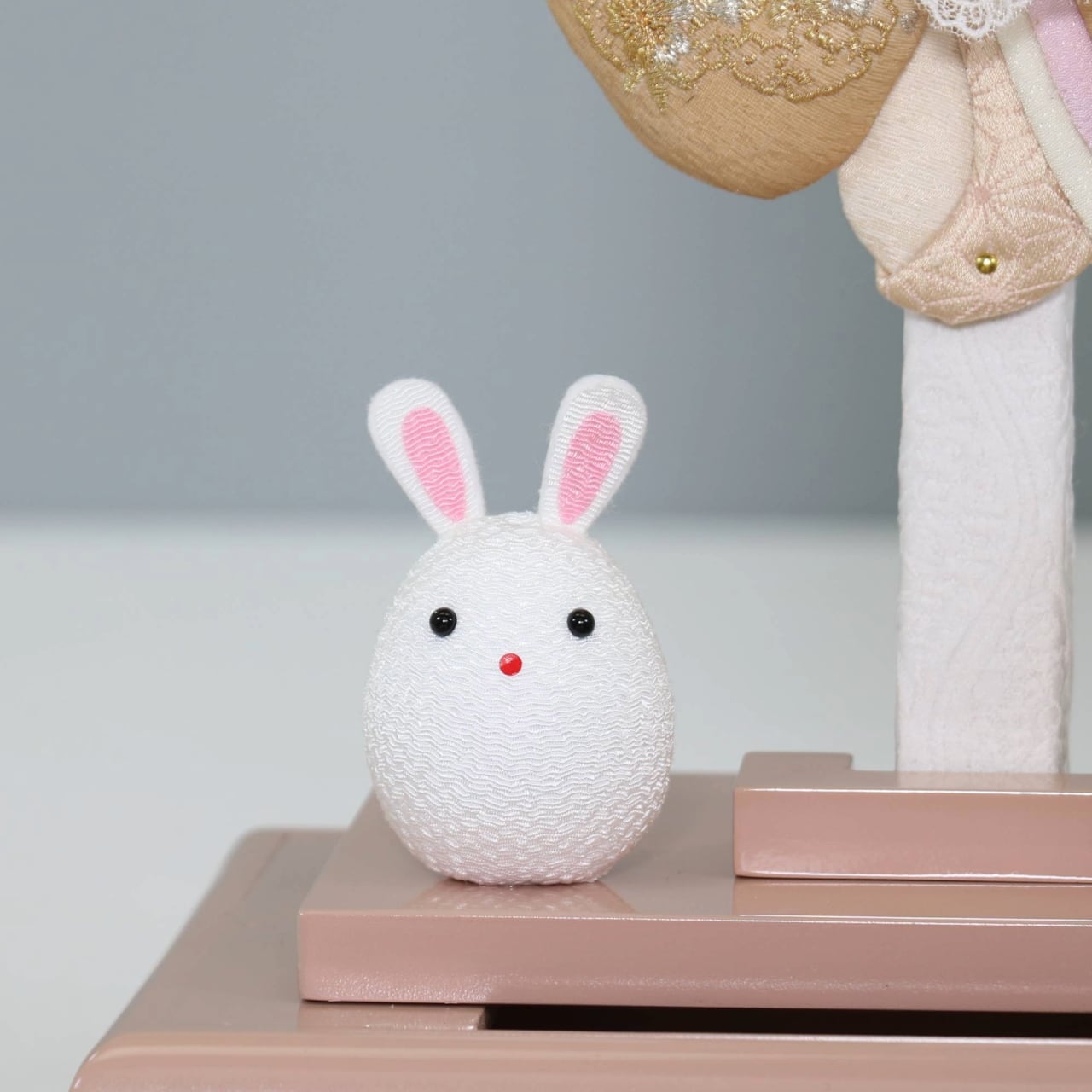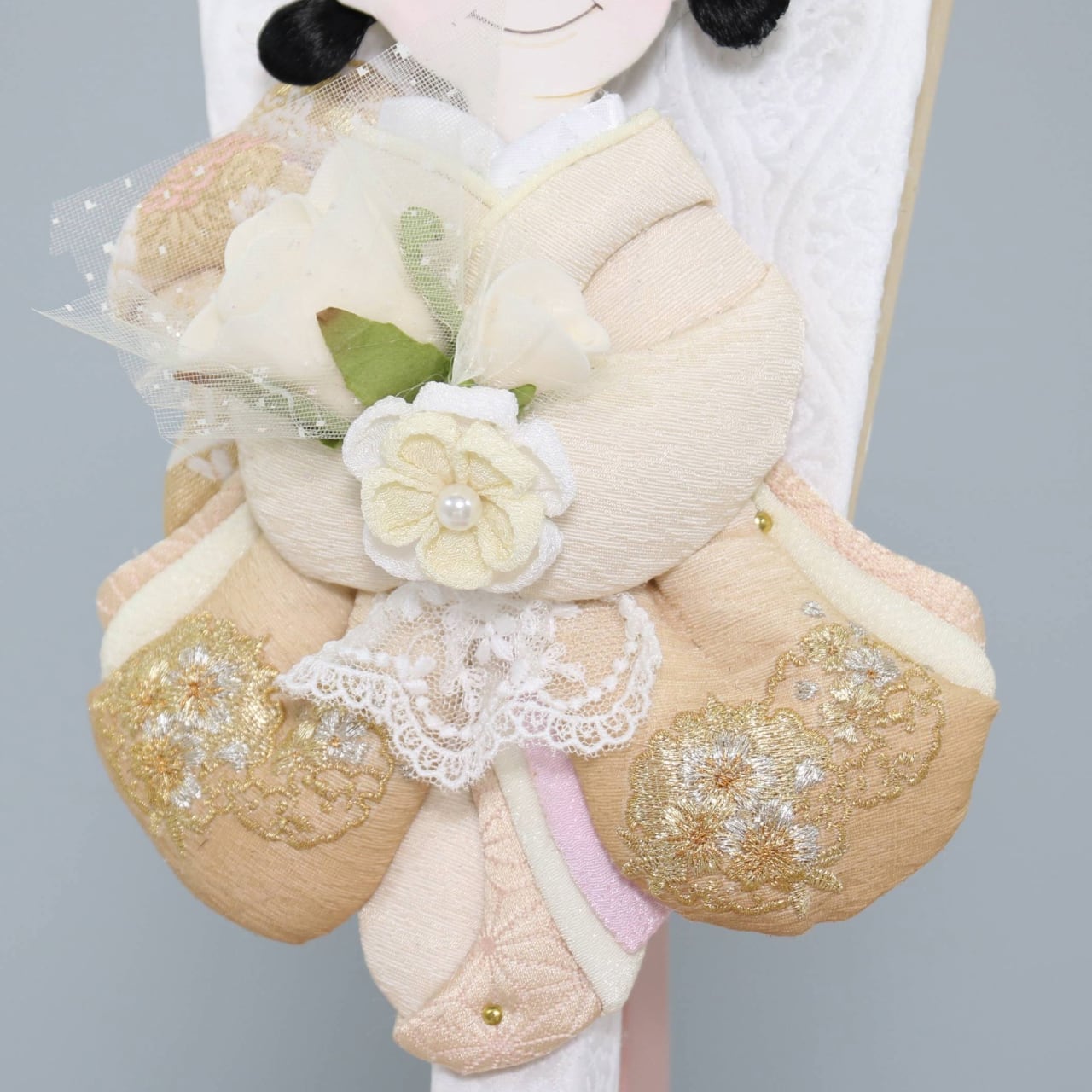 羽子板は淡いクリーム系の振袖衣装を用いた仕立てで、レースや金彩を組み合わせた構成です。表情は微笑み顔のデザインで、柔らかい印象の仕上がりになっています。付属品としてうさぎの置き飾りと木製作札を配置し、ケース内の構成に統一感を持たせています。背景には淡い桜柄の模様を使用し、羽子板の色味と合わせた構成です。