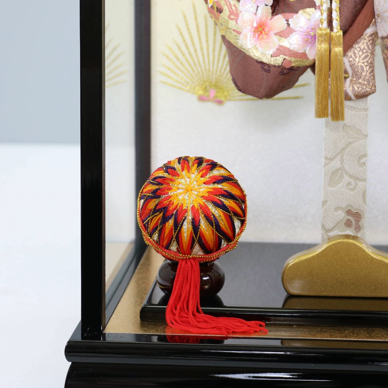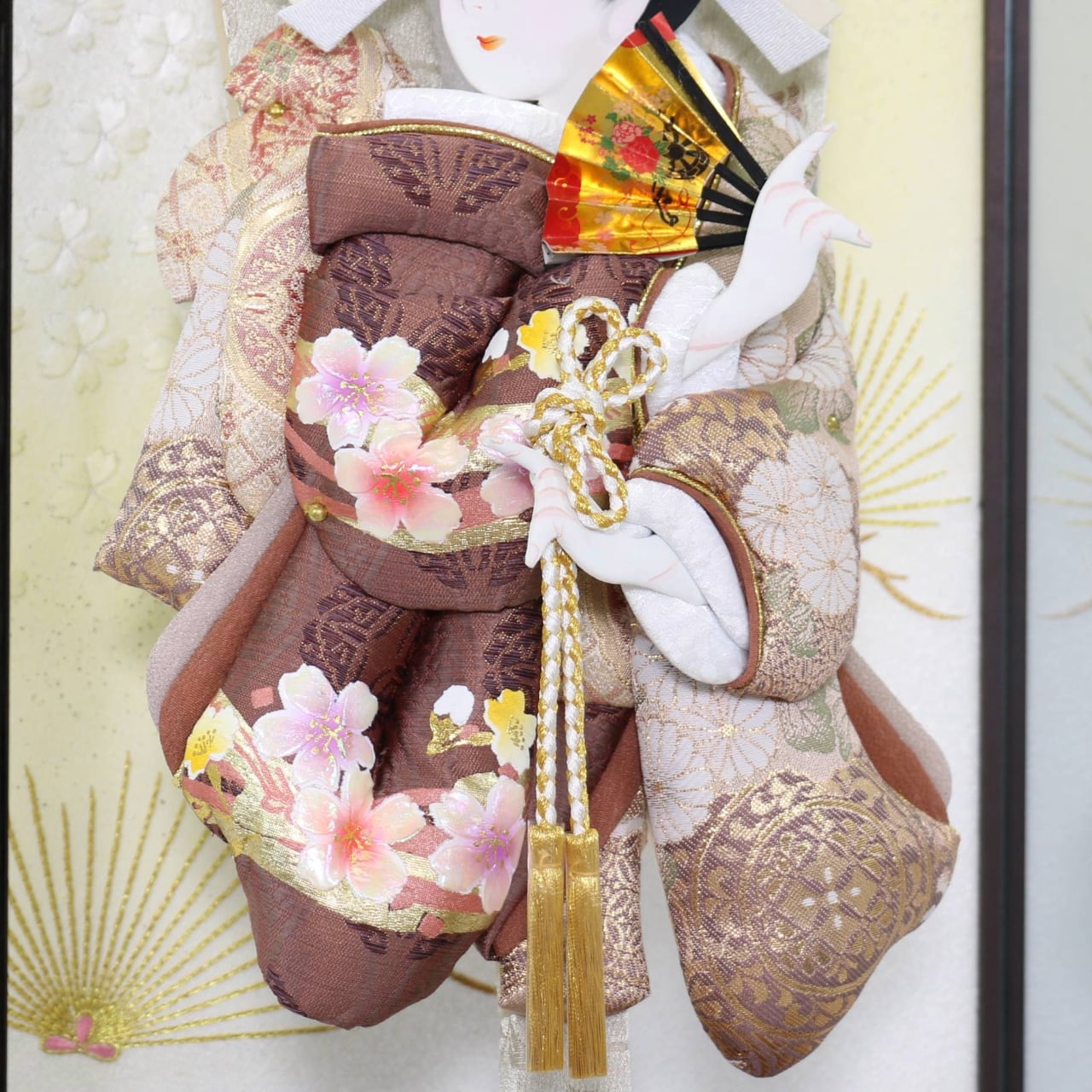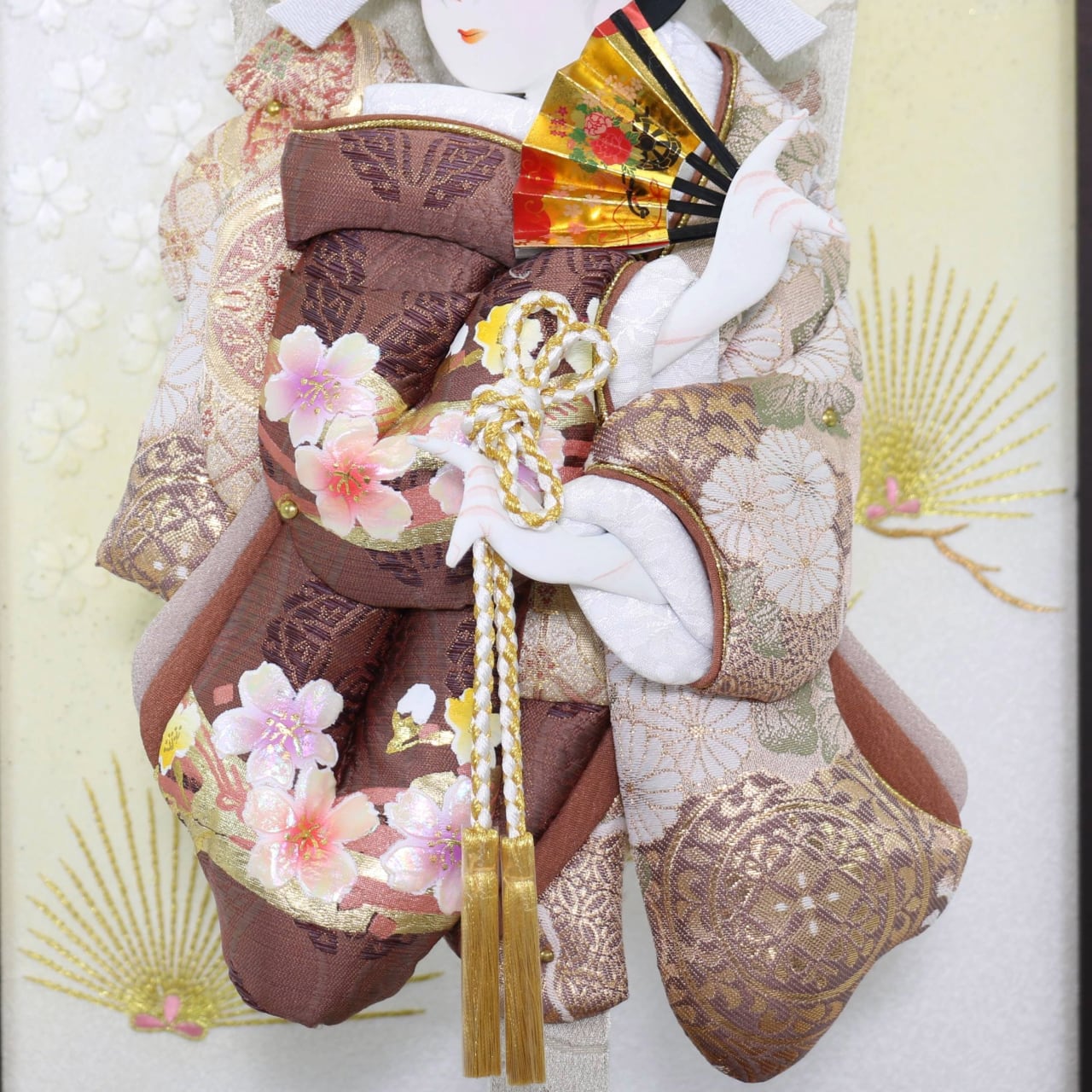 羽子板は茶系の振袖衣装を用いた仕立てで、桜柄や金彩を取り入れた構成です。手元には扇を持ち、頭飾りには花飾りと金細工を使用しています。付属品として手毬飾りと木製作札をケース内に配置し、構成を整えています。背景は白系に金模様を組み合わせた仕様で、羽子板本体の色味に合わせています。