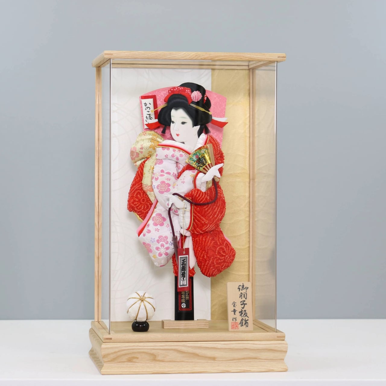 アクリルケースに振袖羽子板を収納した羽子板飾りです。ケースは前面・側面に透明アクリルを使用し、羽子板や付属品を確認しやすい構造です。木目を活かしたフレームと台座を採用し、明るい色調でまとめています。