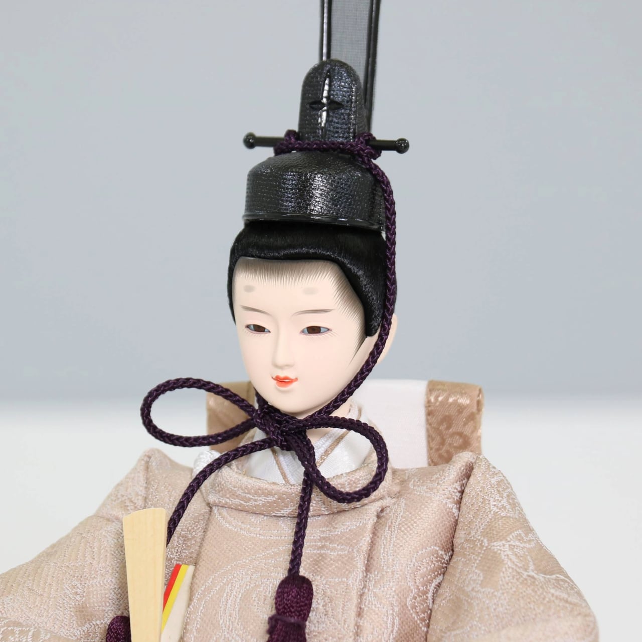白木のかすみ収納台に、落ち着いた色調でまとめられたお殿様・お姫様を配した親王飾りです。