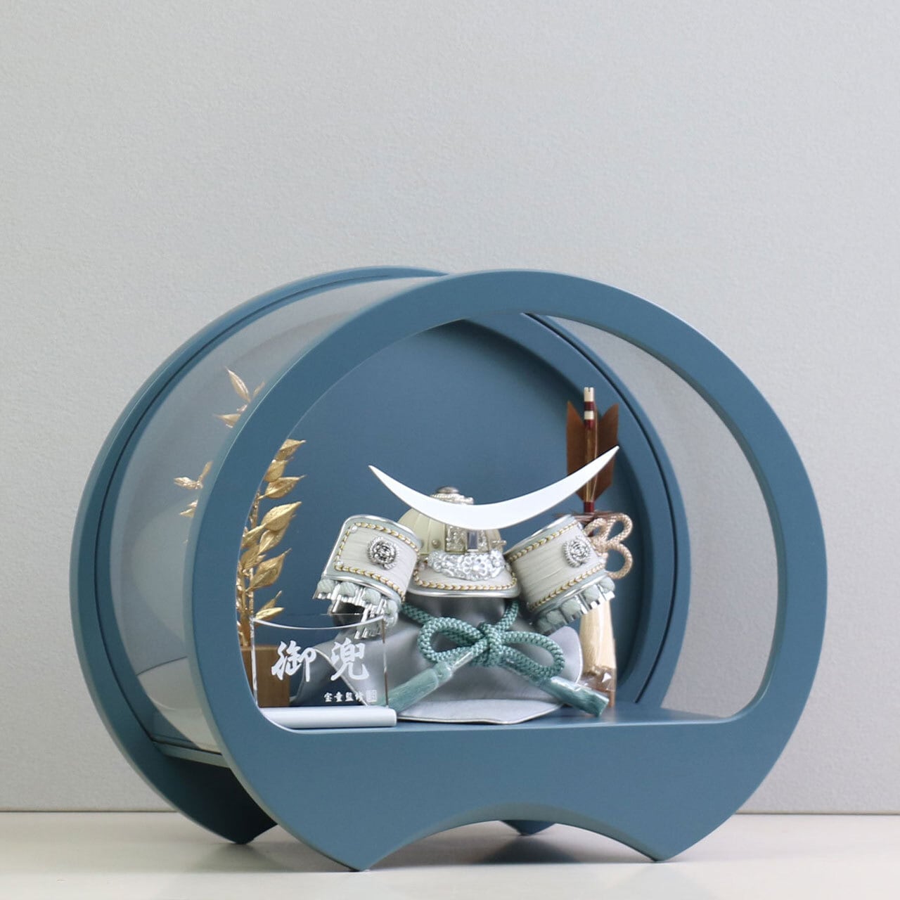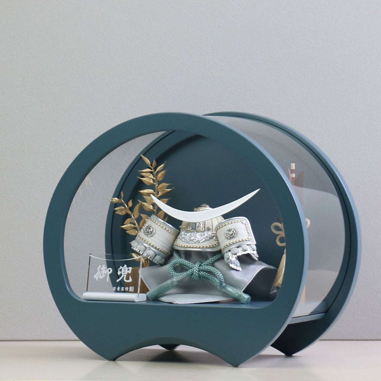 深みのある色合いのブルードームケースにシルバー色の伊達政宗兜をセットしました。