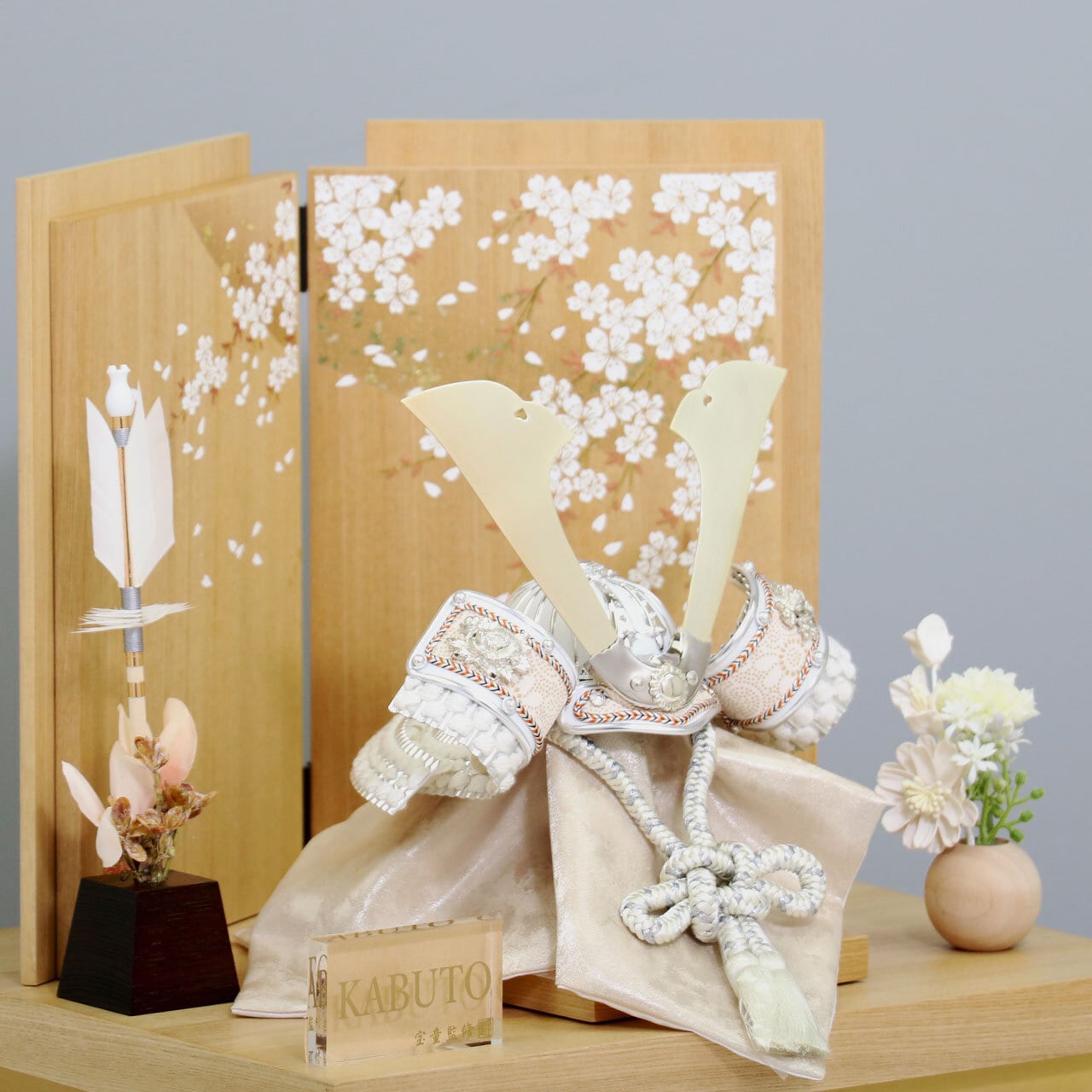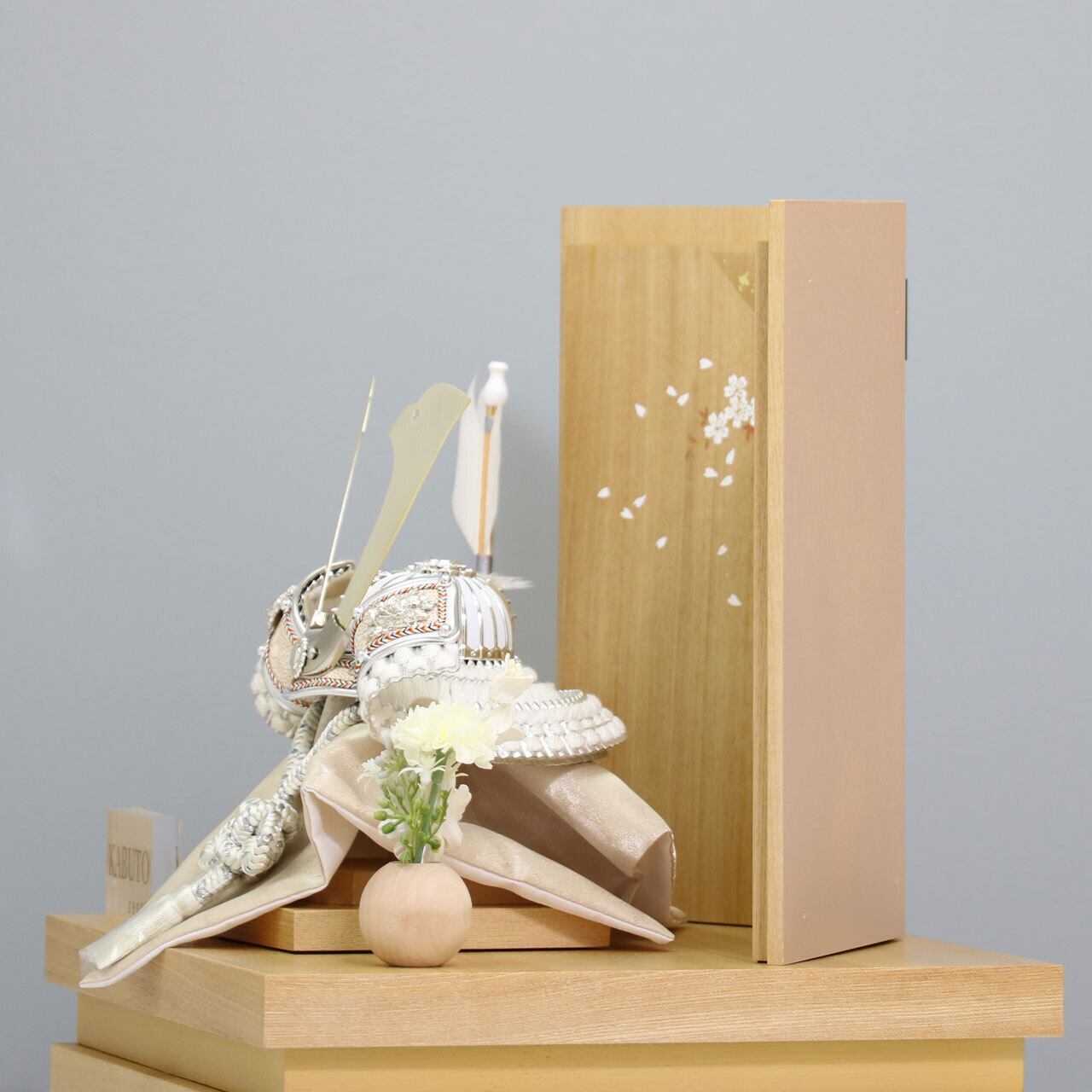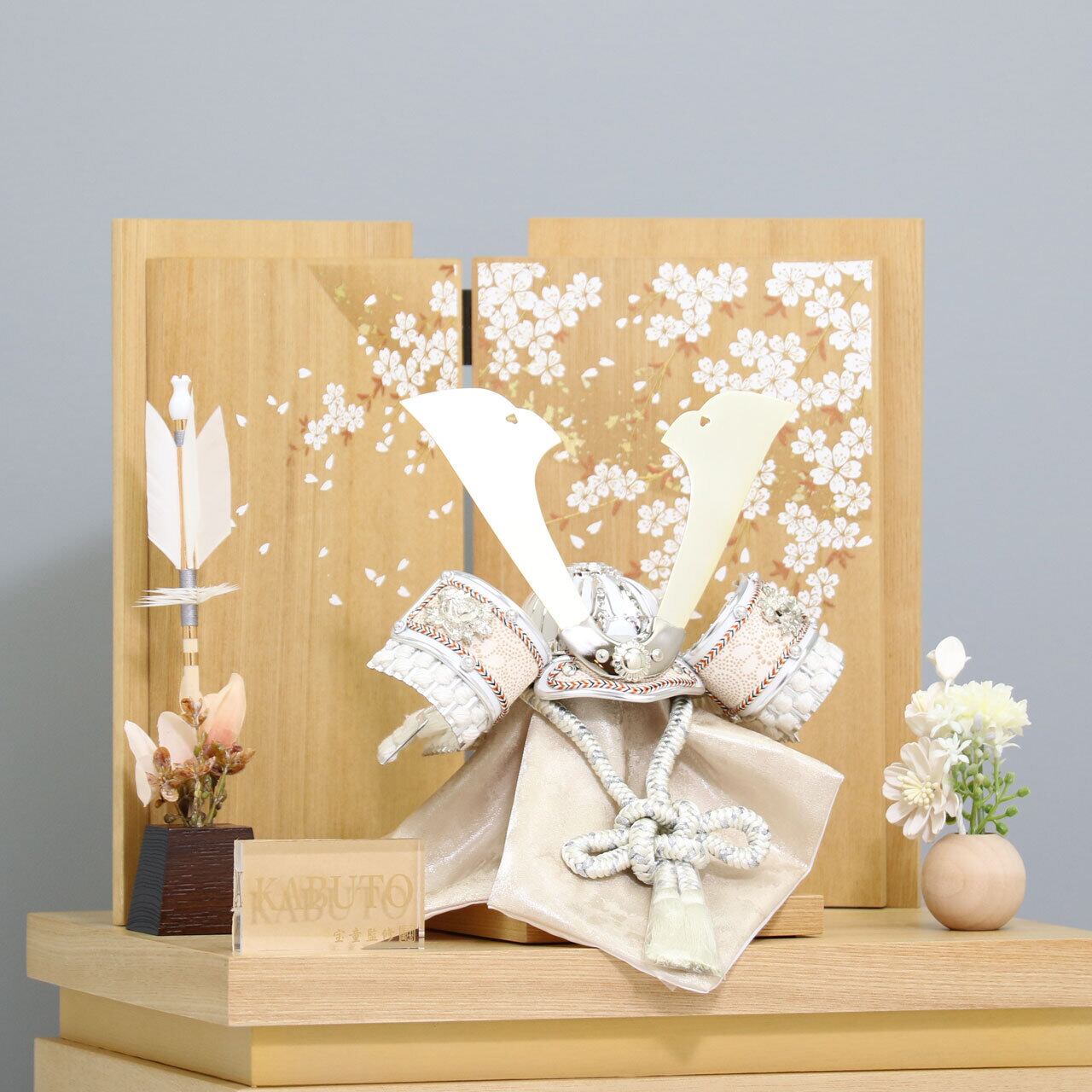 白木の温かみある飾り台に、華やかな花模様をあしらった屏風を組み合わせた「白金中鍬兜 7号」です。