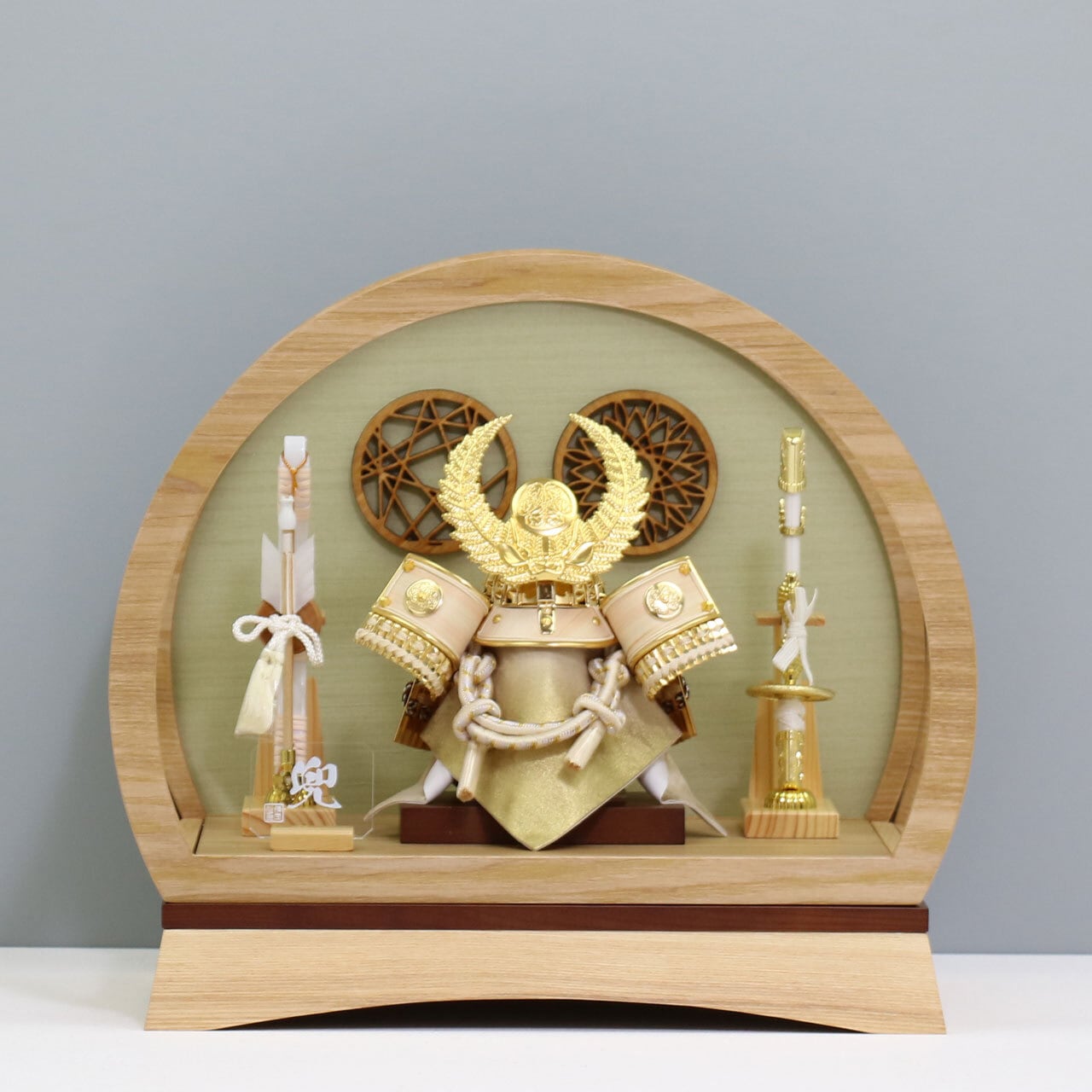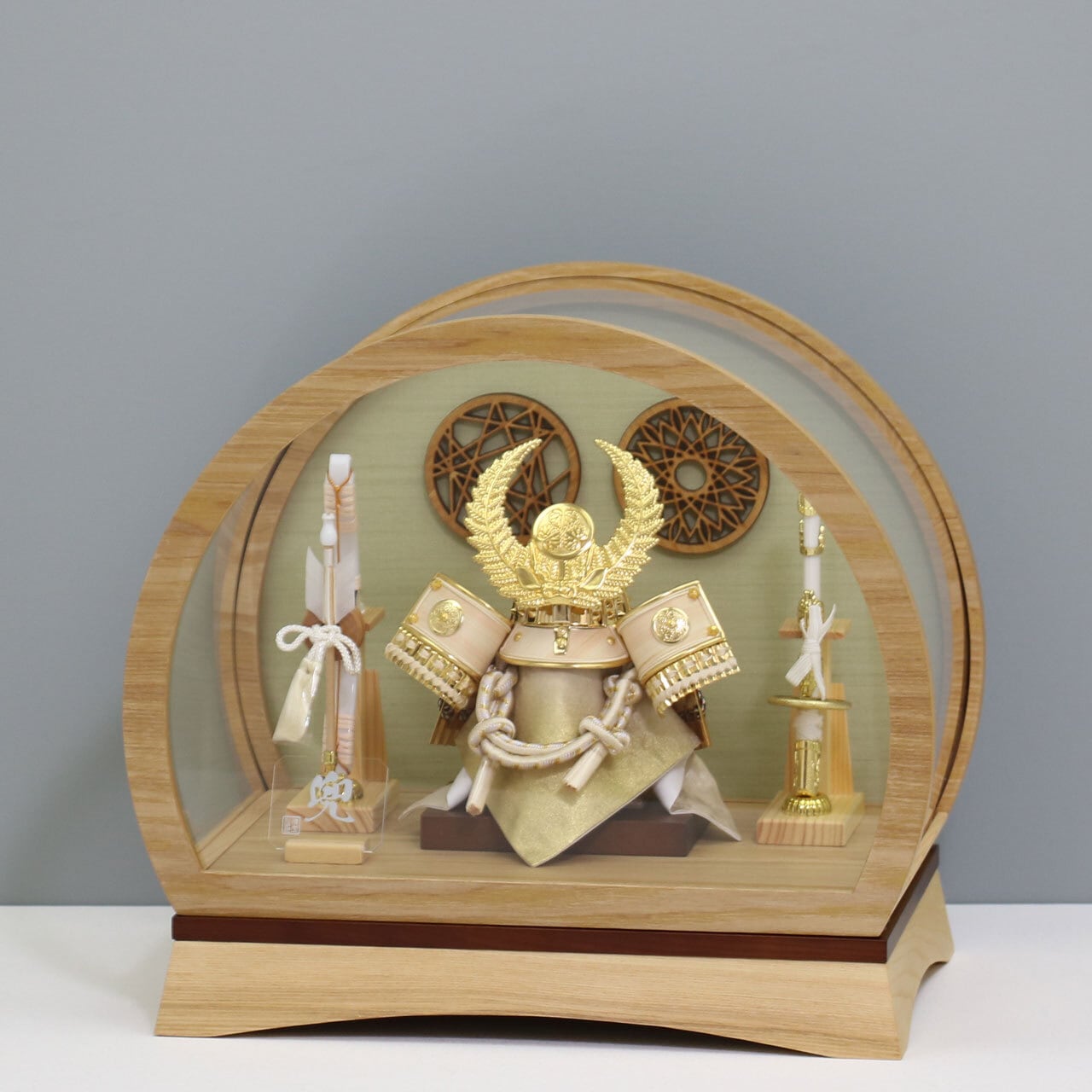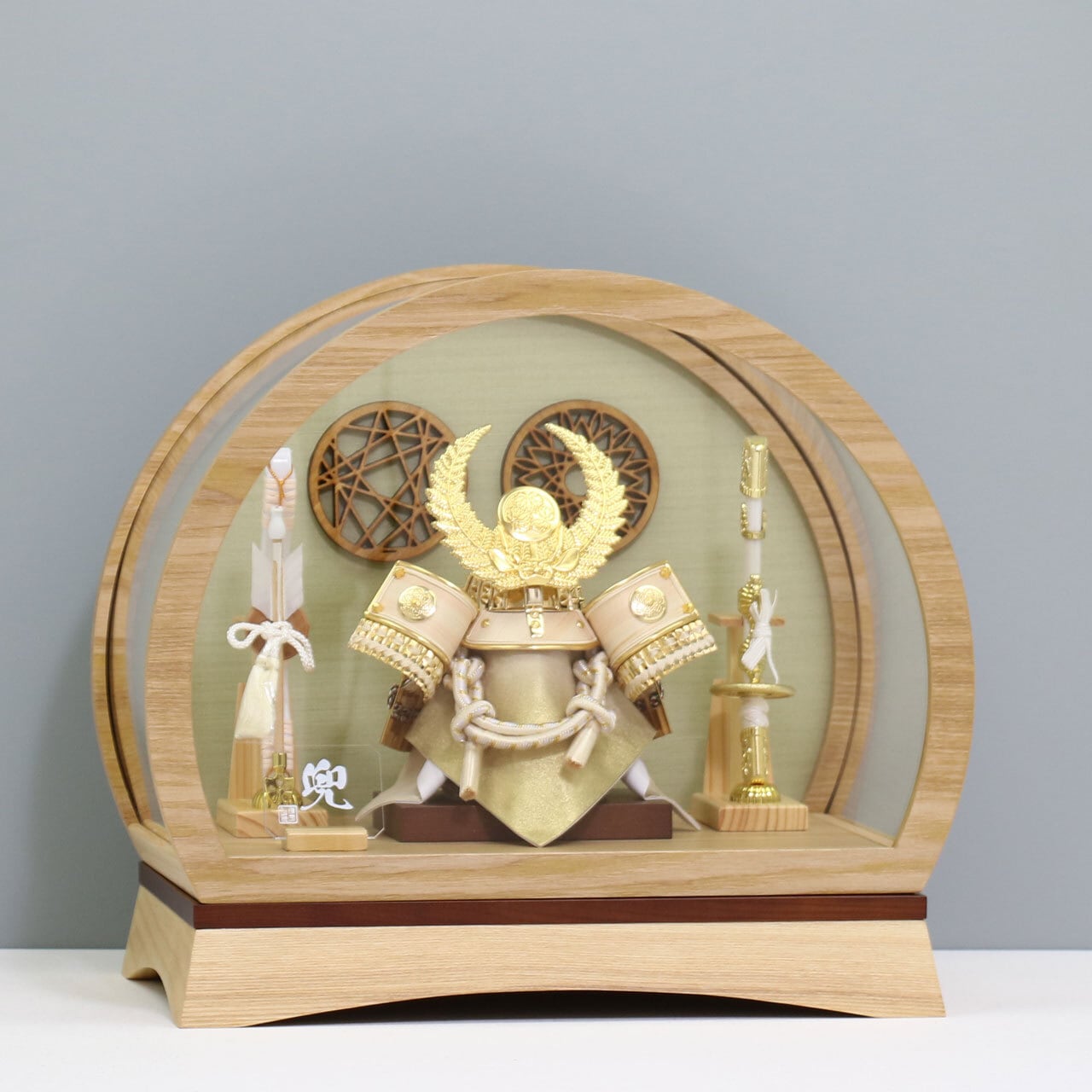 【徳川家康 5号】 兜飾り ドーム型アクリルケース飾り 五月人形|矢付き|木目調|和モダン|コンパクト