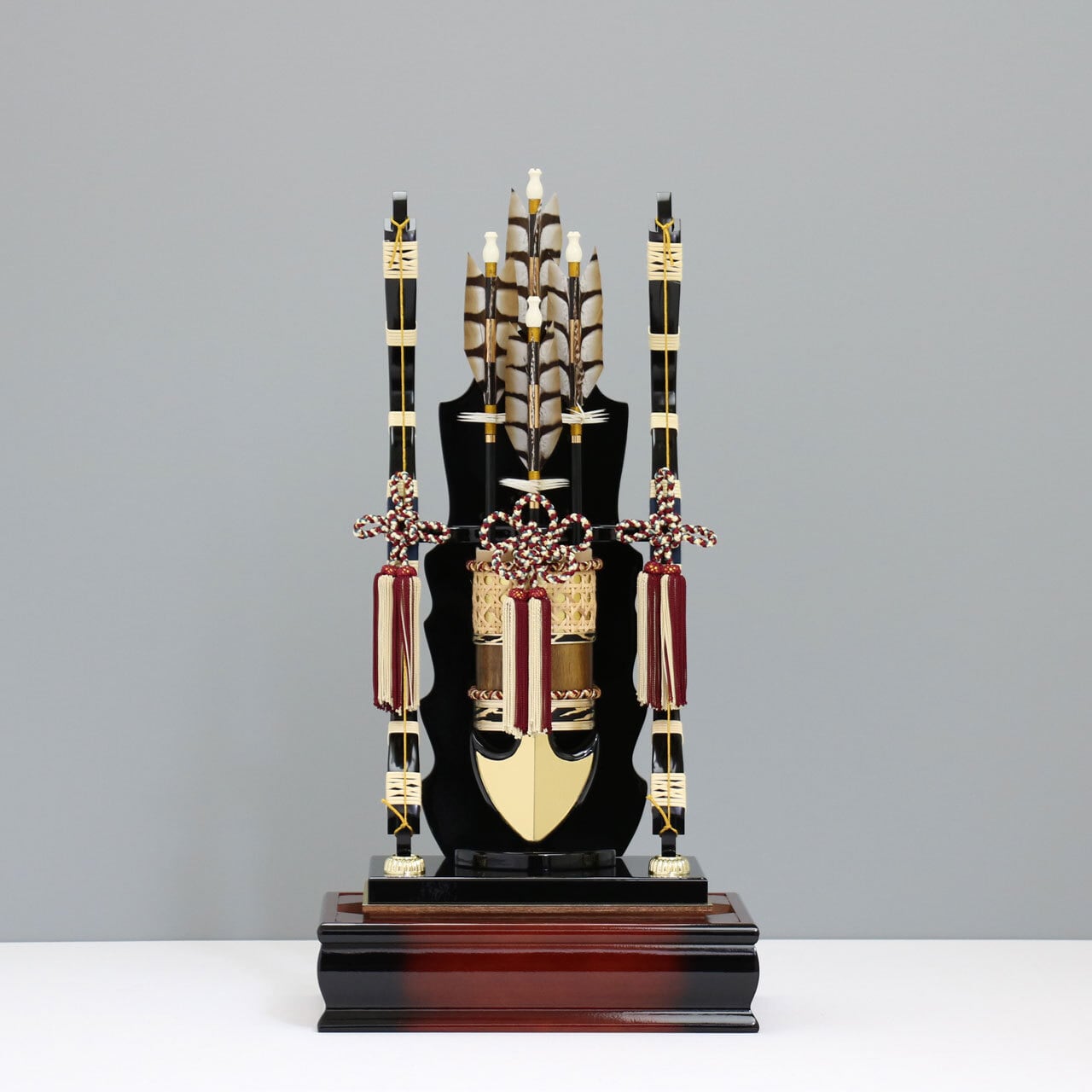 高級感あふれる花梨ぼかし塗りを施した伝統的な破魔弓飾りです。