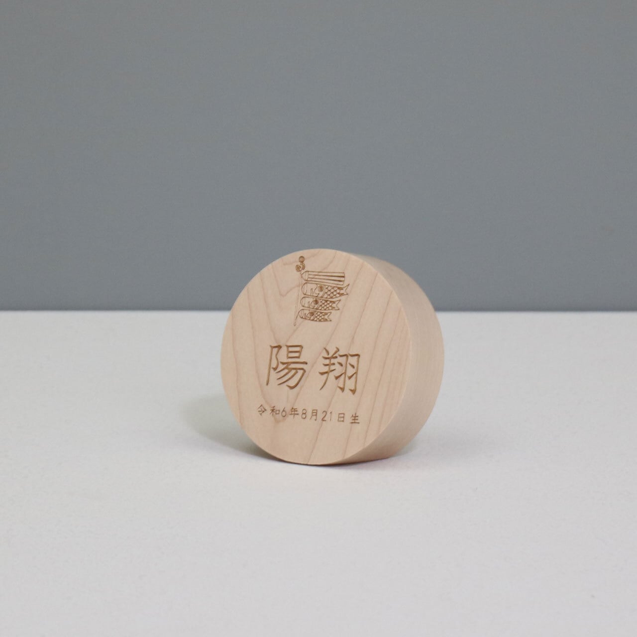レーザー彫刻にてお名前と生年月日をお入れすることができ、お名前は最大3文字まで対応、生年月日は元号での表記となります。(例:令和8年5月5日)
