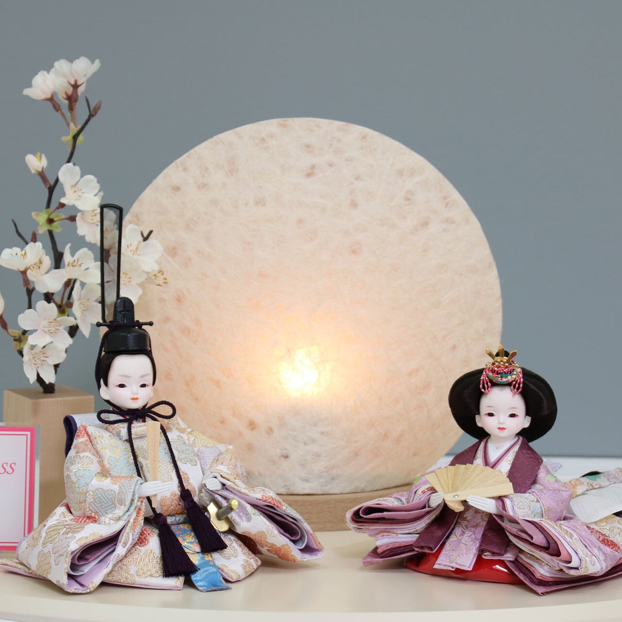 明るい色合いのメイプル調「オーバルクレール」平台に、落水紙を使用した丸型照明を組み合わせた親王飾りです。