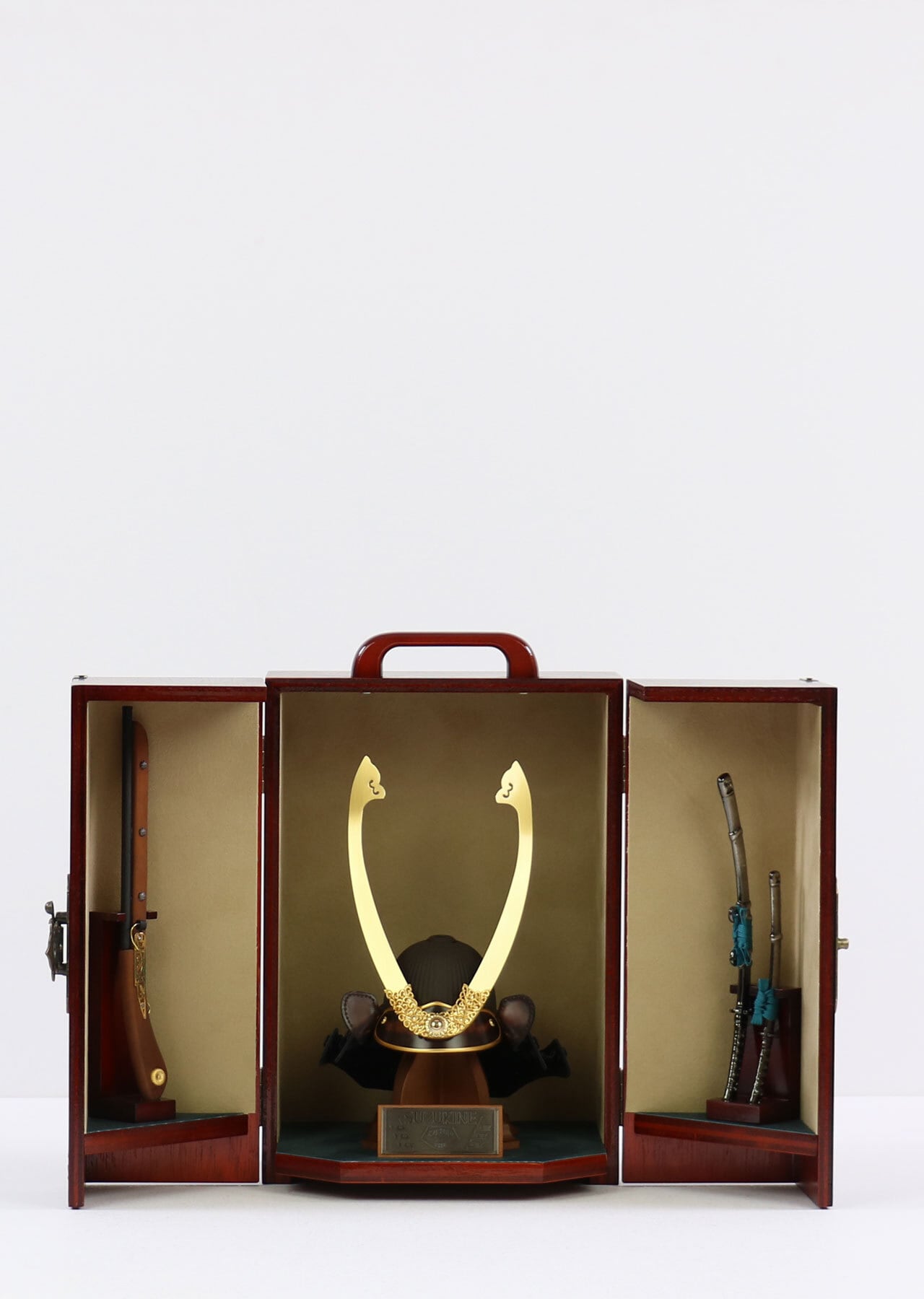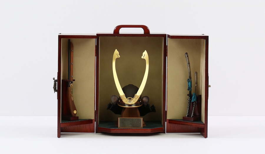 付属の火縄銃飾りや太刀飾りが兜を一層引き立て、存在感ある仕上がりになっています。