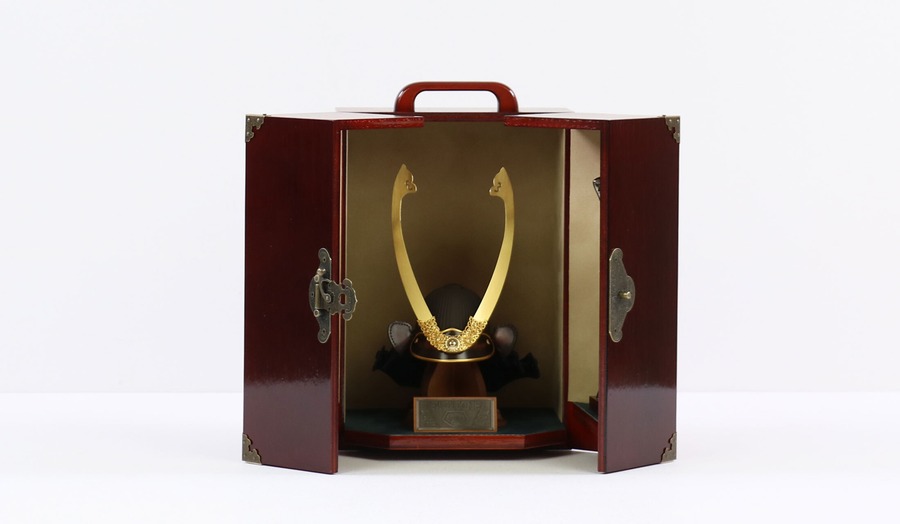 また、新設計の固定式「伍代セット」は省スペース仕様となっており、開閉によってサイズが変えられる実用的なデザイン。収納性と飾り映えを両立した兜飾りです。
